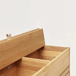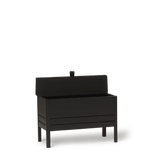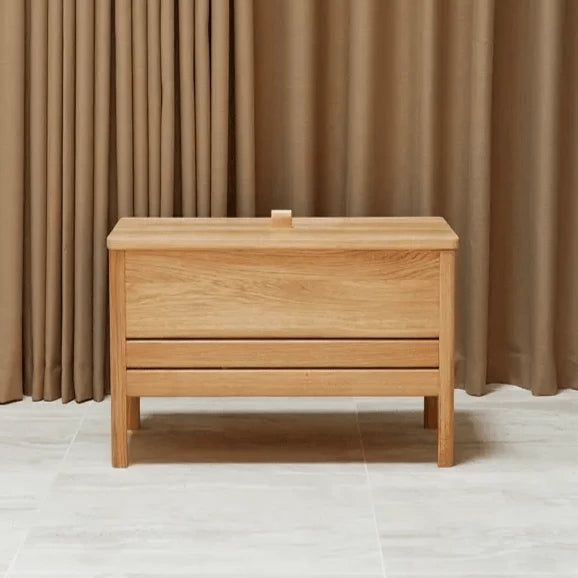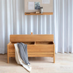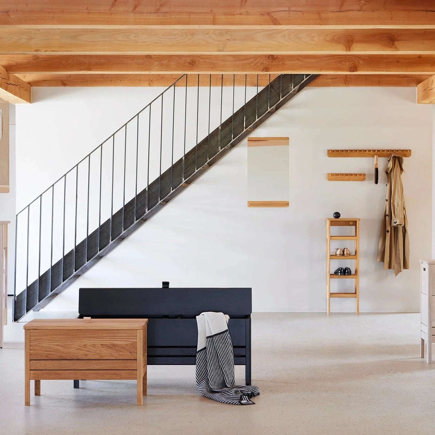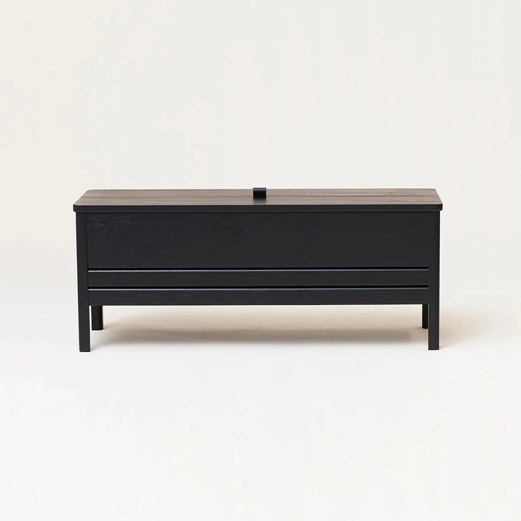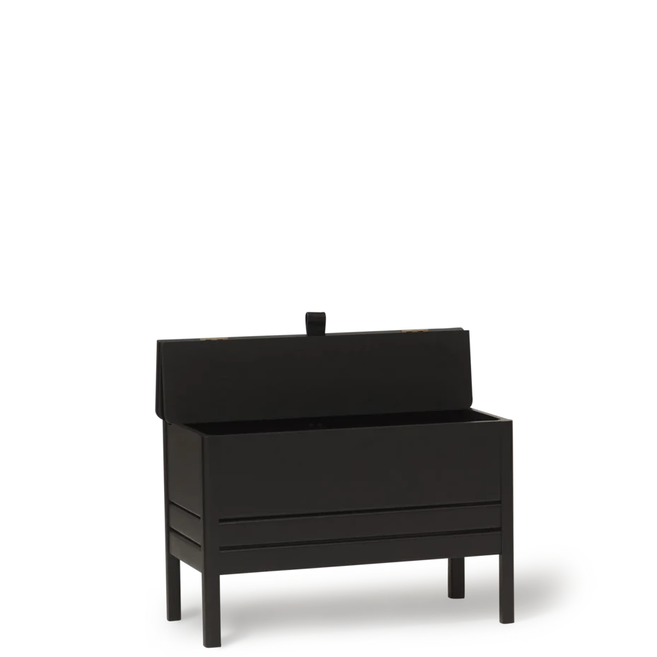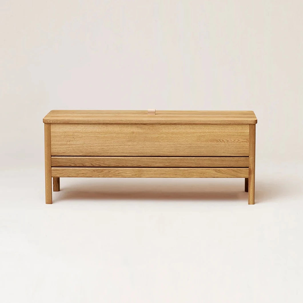 An updated version of the classic stowaway bench where functionality meets clean form. A solid and versatile bench with lighter, slightly reduced dimensions and minimalistic attitude. It is practical with a large area for storage – consisting of two separated compartments. The lid is lifted via a small leather handle and the construction holds the lid in place while used. The lower cut of the two legs and angles give it a feeling of being uplifted, while overall design is solid and robust. A versatile bench either as a stand - alone item in a hallway, bedroom or any seating area.