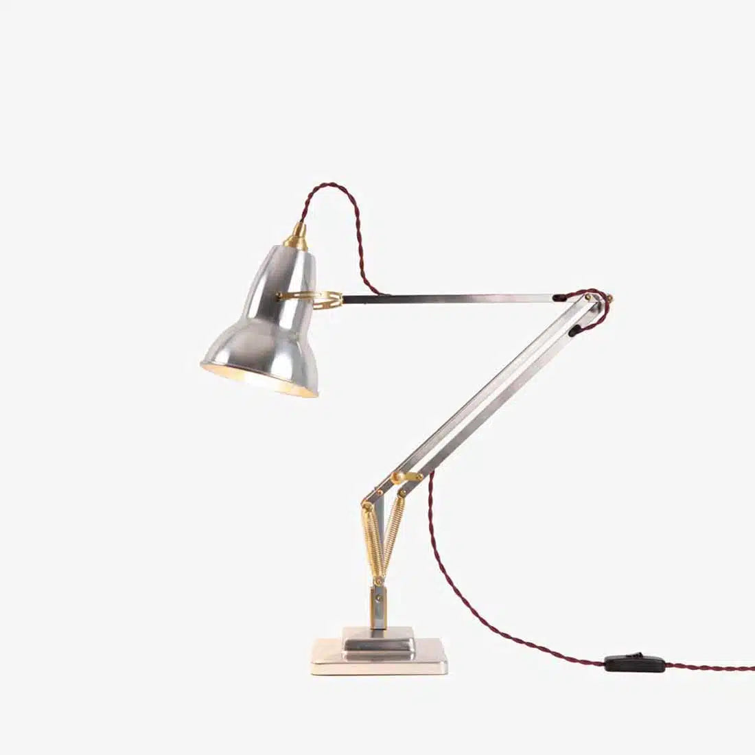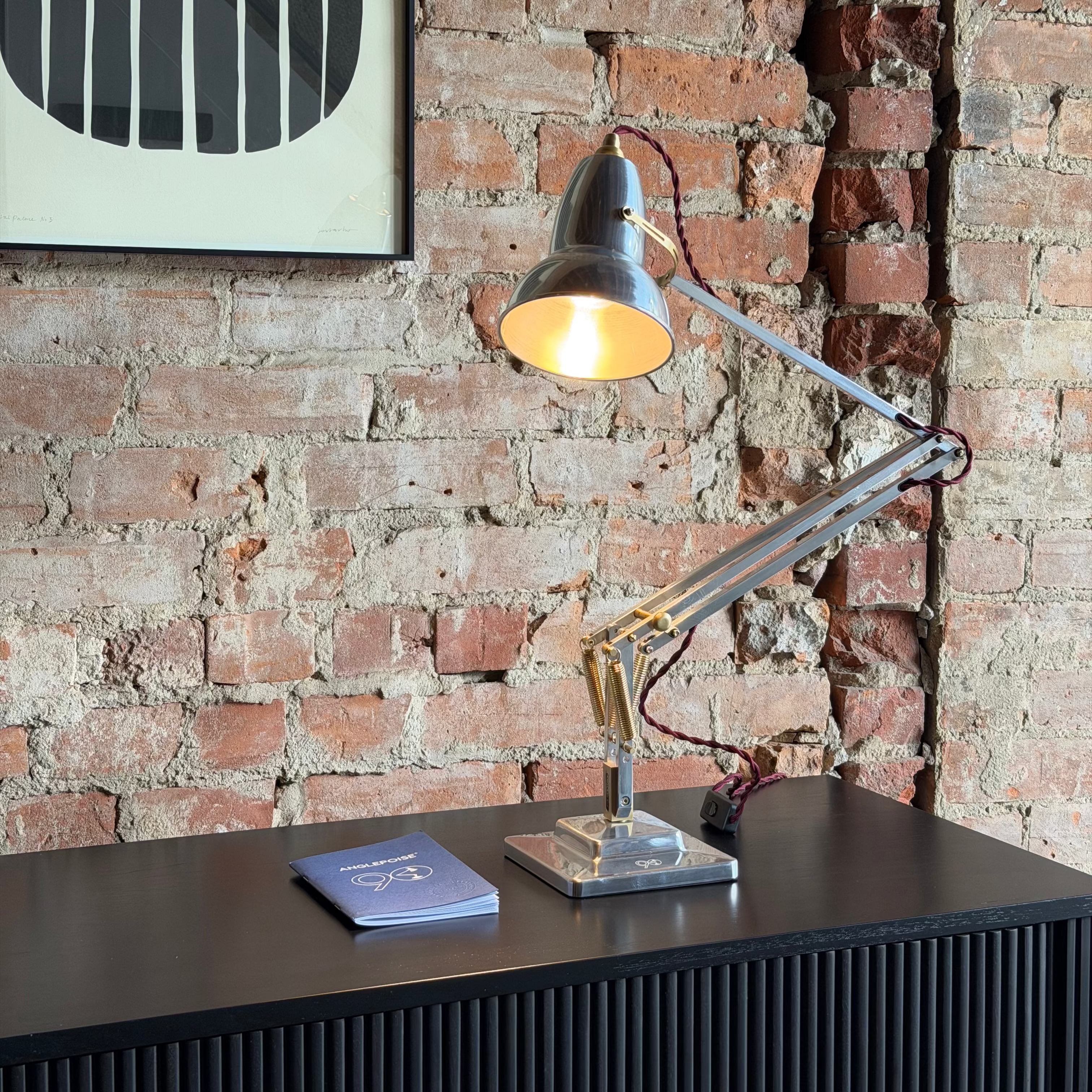 A limited edition of 400 individually numbered products. Form and function, stripped back to a polished aluminium frame, finished off with brass detailing and a braided burgundy flex. A minor miracle of balance 90 years in the making. Limited stock available.