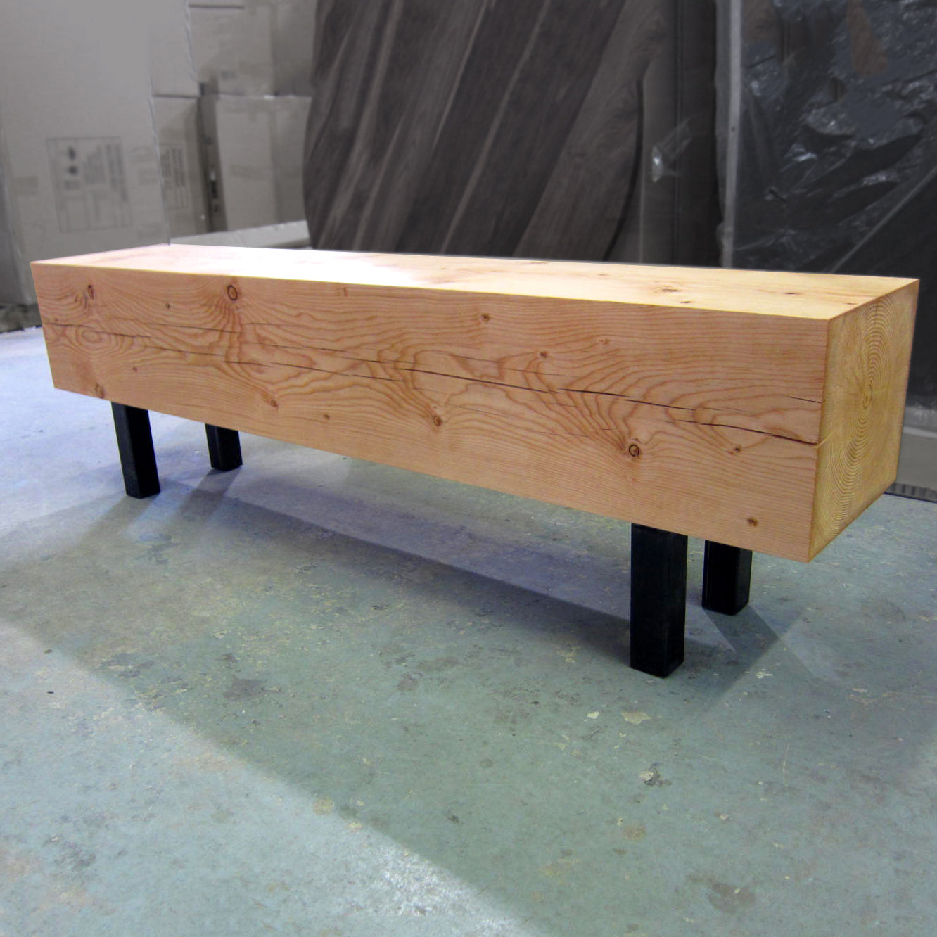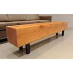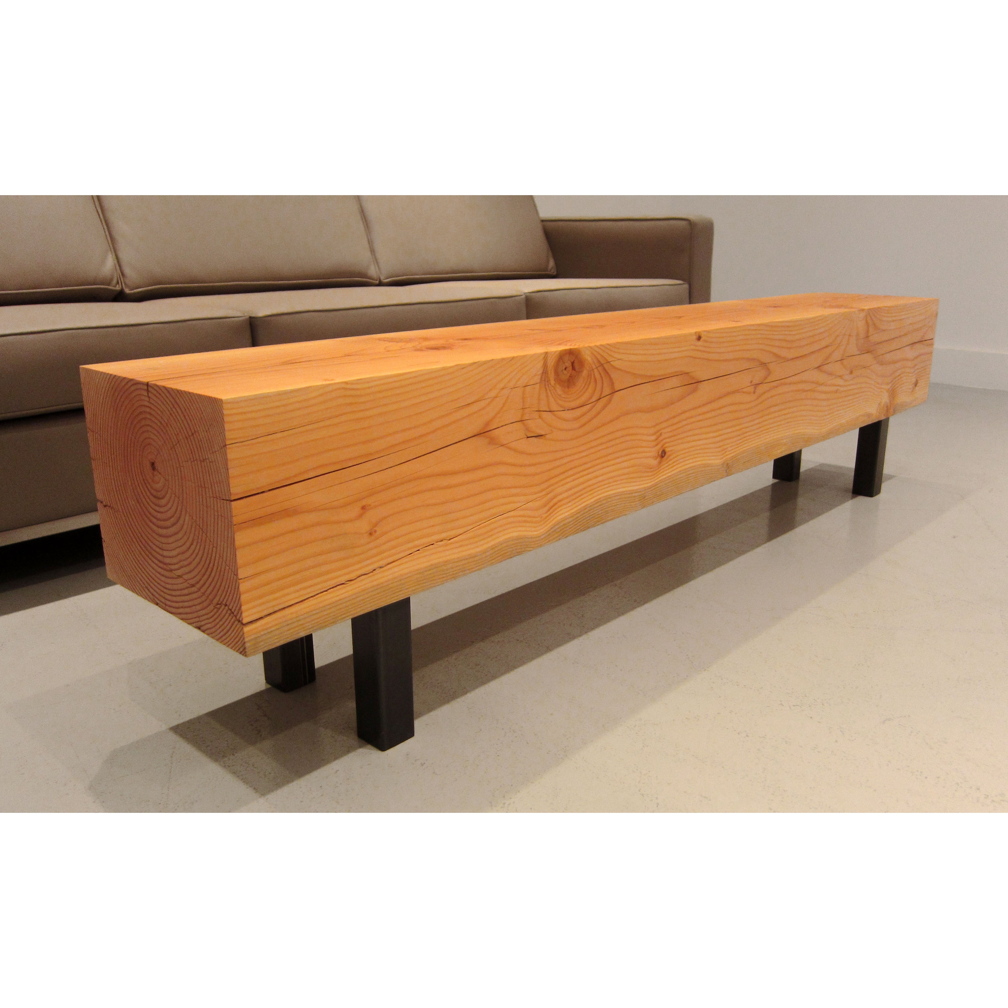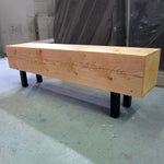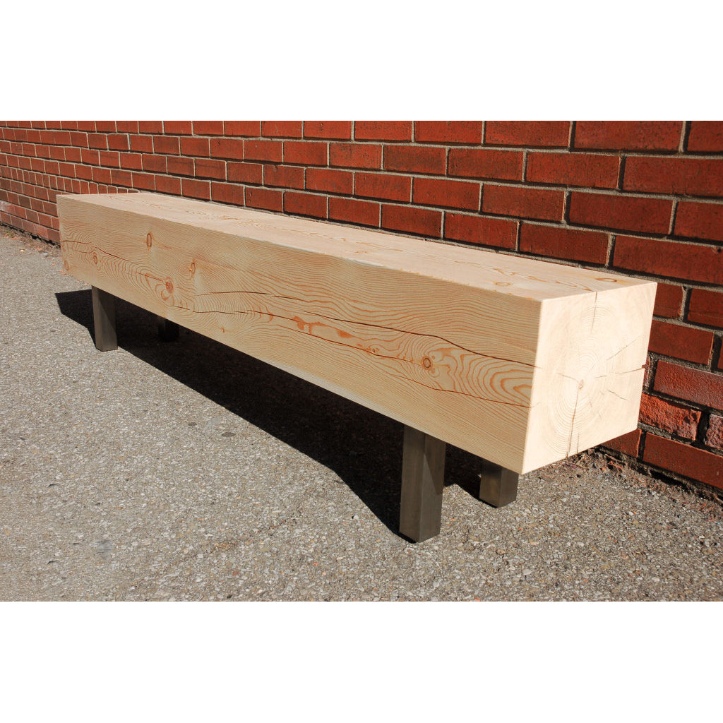 A 10" thick solid Douglas Fir beam is air dried for a rustic natural finish that will evolve over the bench's lifetime. Paired with stainless steel legs for a modern kick or hot-rolled steel for an industrial look, both with leveler feet. The beam gives the bench a standard depth of approximately 12" but all other dimensions can be customized.