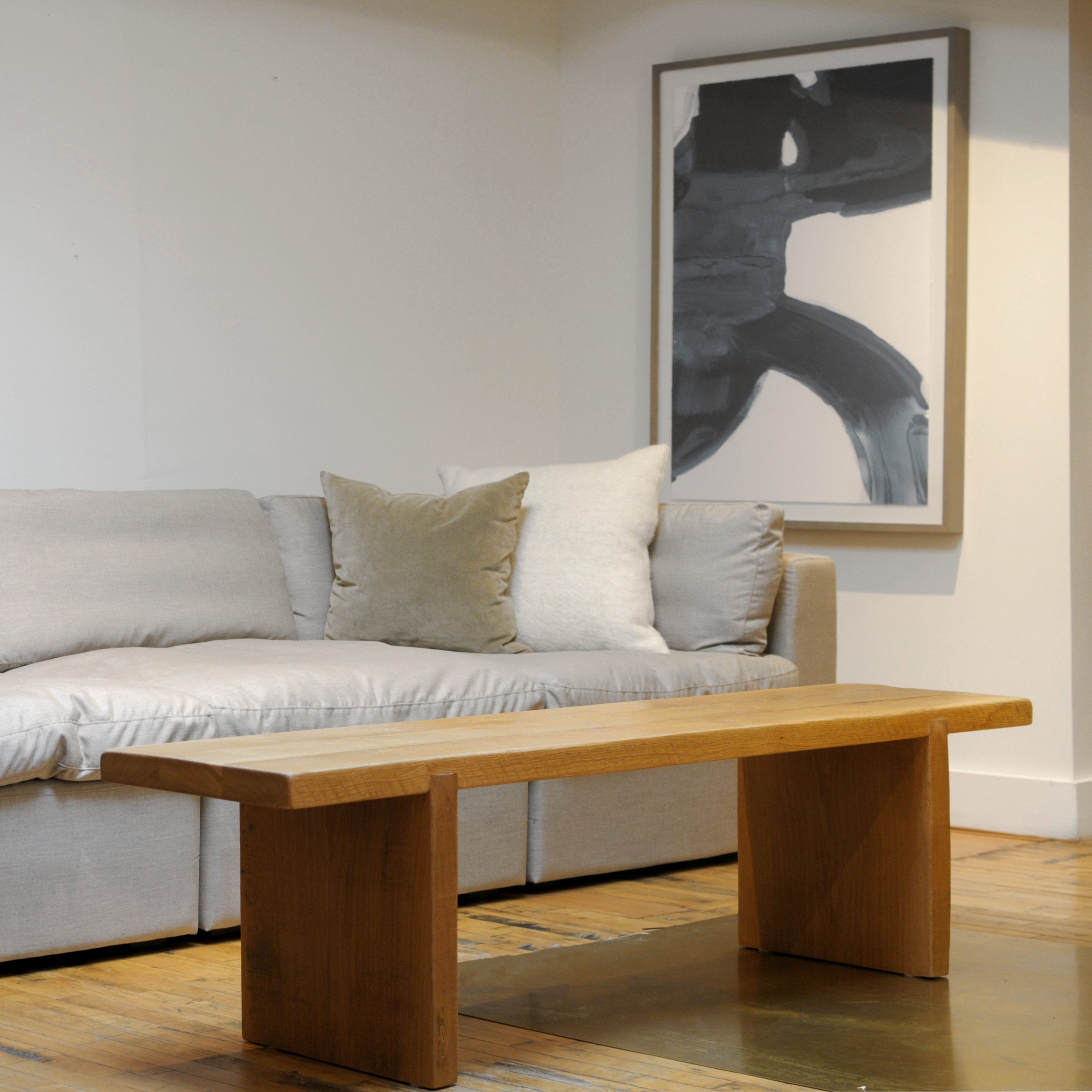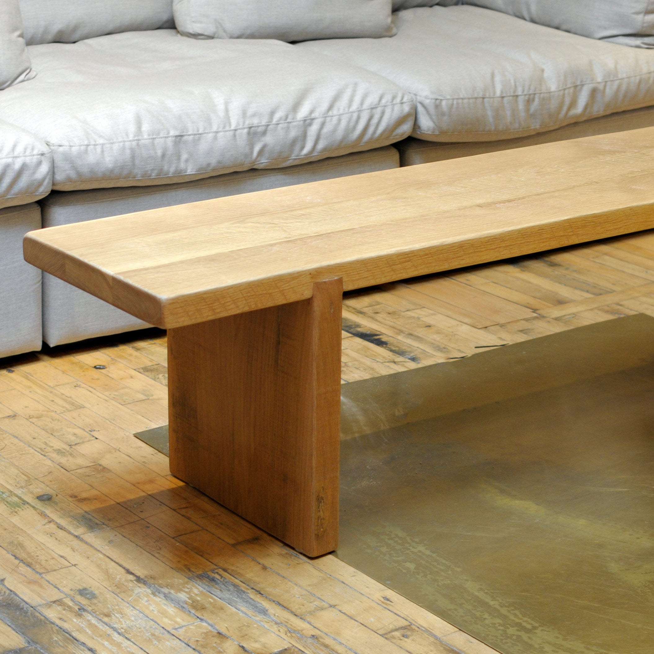 A substantial, low-profile multi-purpose bench that is streamlined yet rustic. A natural, rough-sawn oak top offers character and intriguing visual texture.