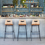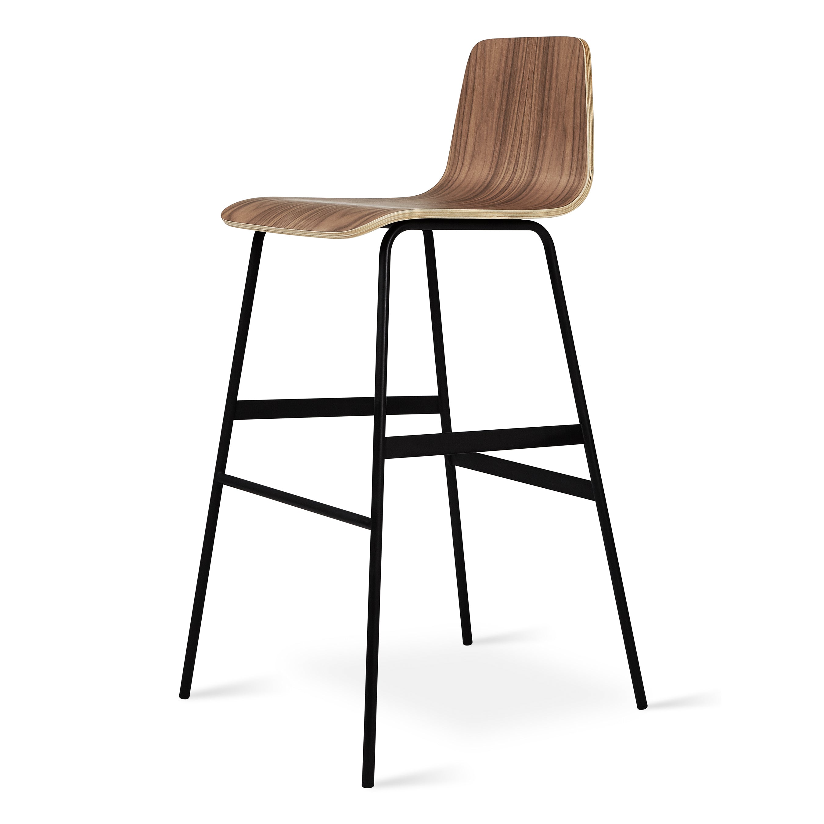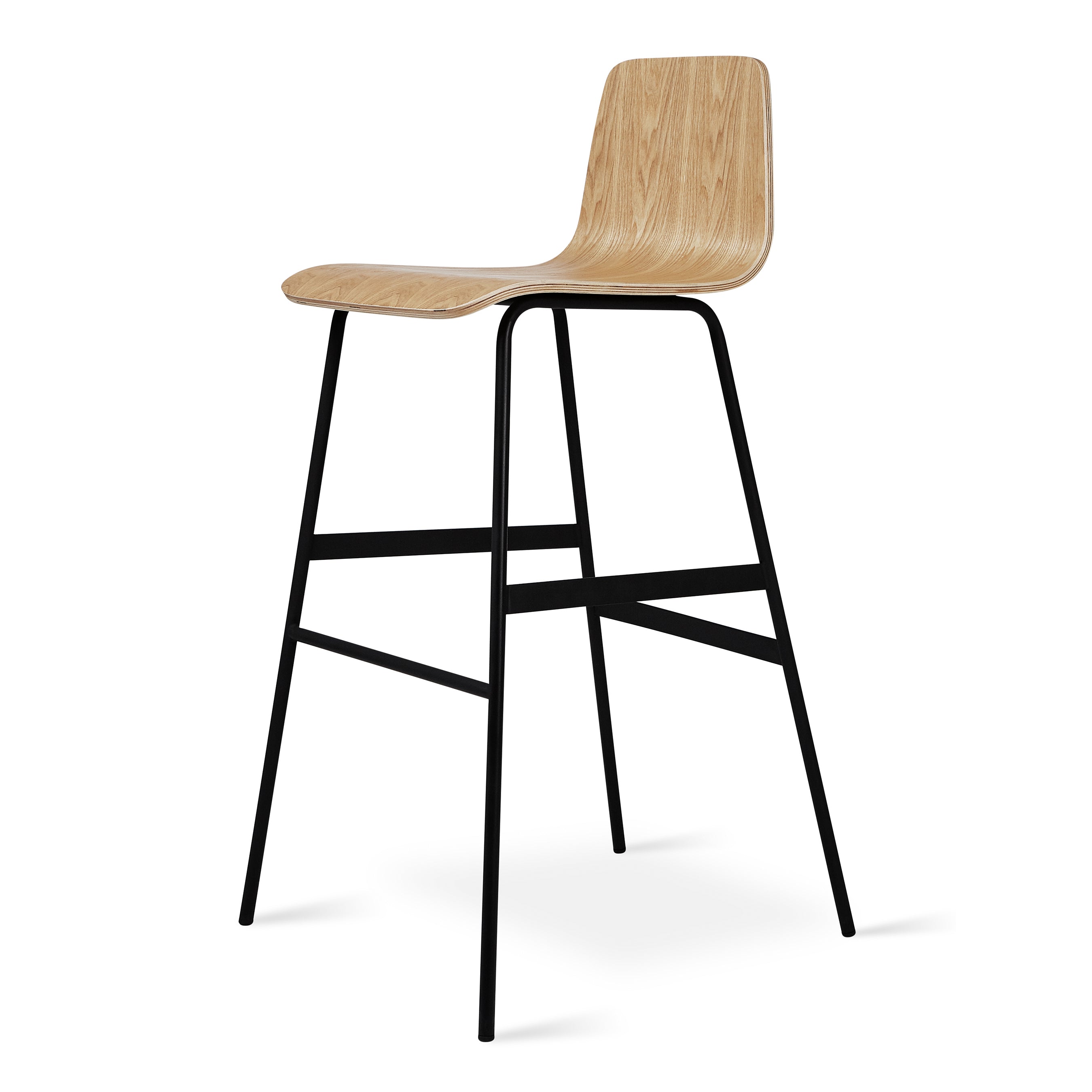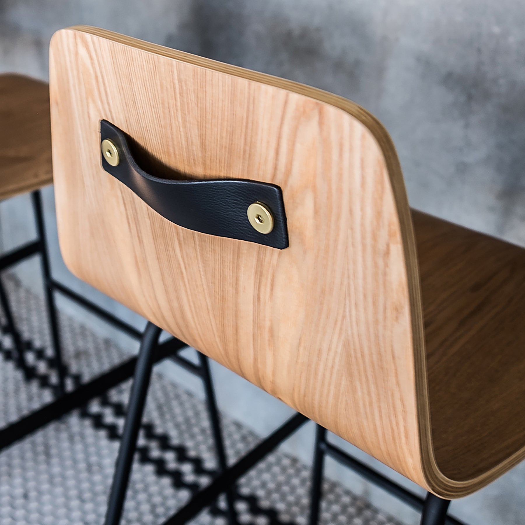The Lecture Bar Stool is a modern reinterpretation of a classic elementary school chair design, adapted for bar height use. The design features a one-piece, bent-plywood seat and back, with a functional leather and brass handle. The black, powder-coated steel legs are reinforced with sturdy flat bar stabilizers and a simple ergonomic footrest. The Lecture Bar Stool combines comfort, design, and durability.