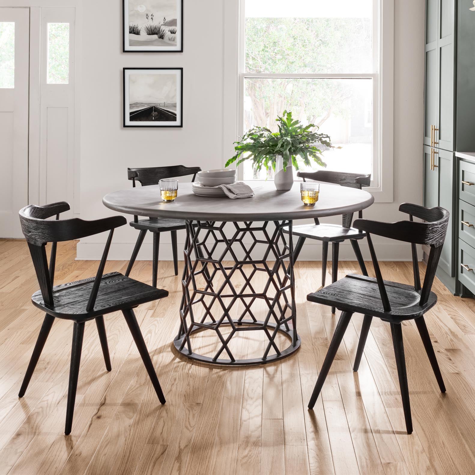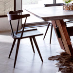 A modern take on the mid-century Windsor chair. A soft black finish adds movement to the wood by highlighting the natural grain of weathered oak.