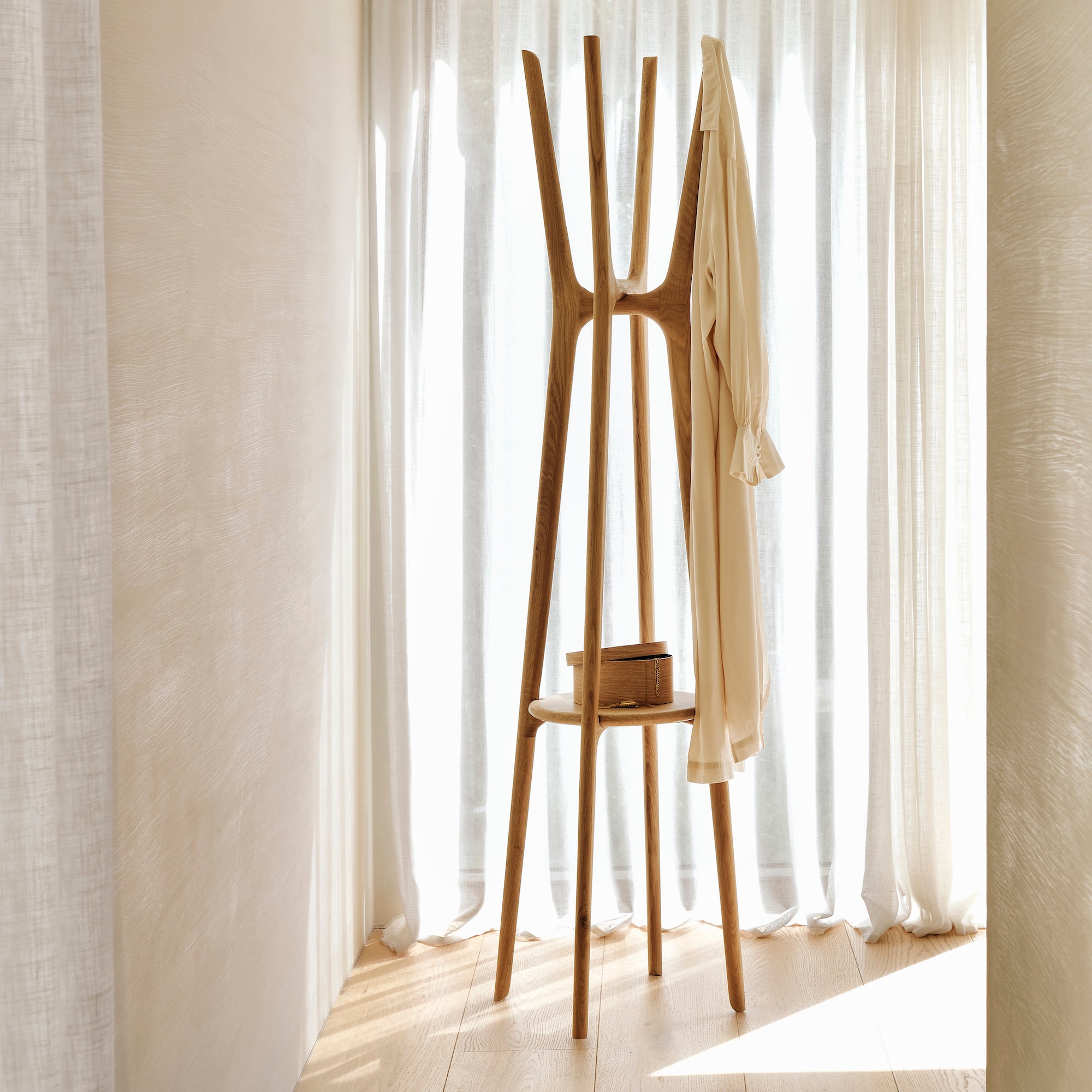 The PI collection honours nature’s design by keeping the strength, curves and lines, as nature intended. Interesting shapes are discovered in this sleek and stylish, polished imperfect, finish. Each PI item is finished by hand to ensure that the individual character of the wood is respected. The PI coat stand stylishly stores coats, hats and other personal effects with ease.