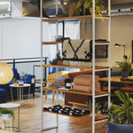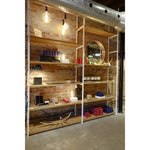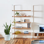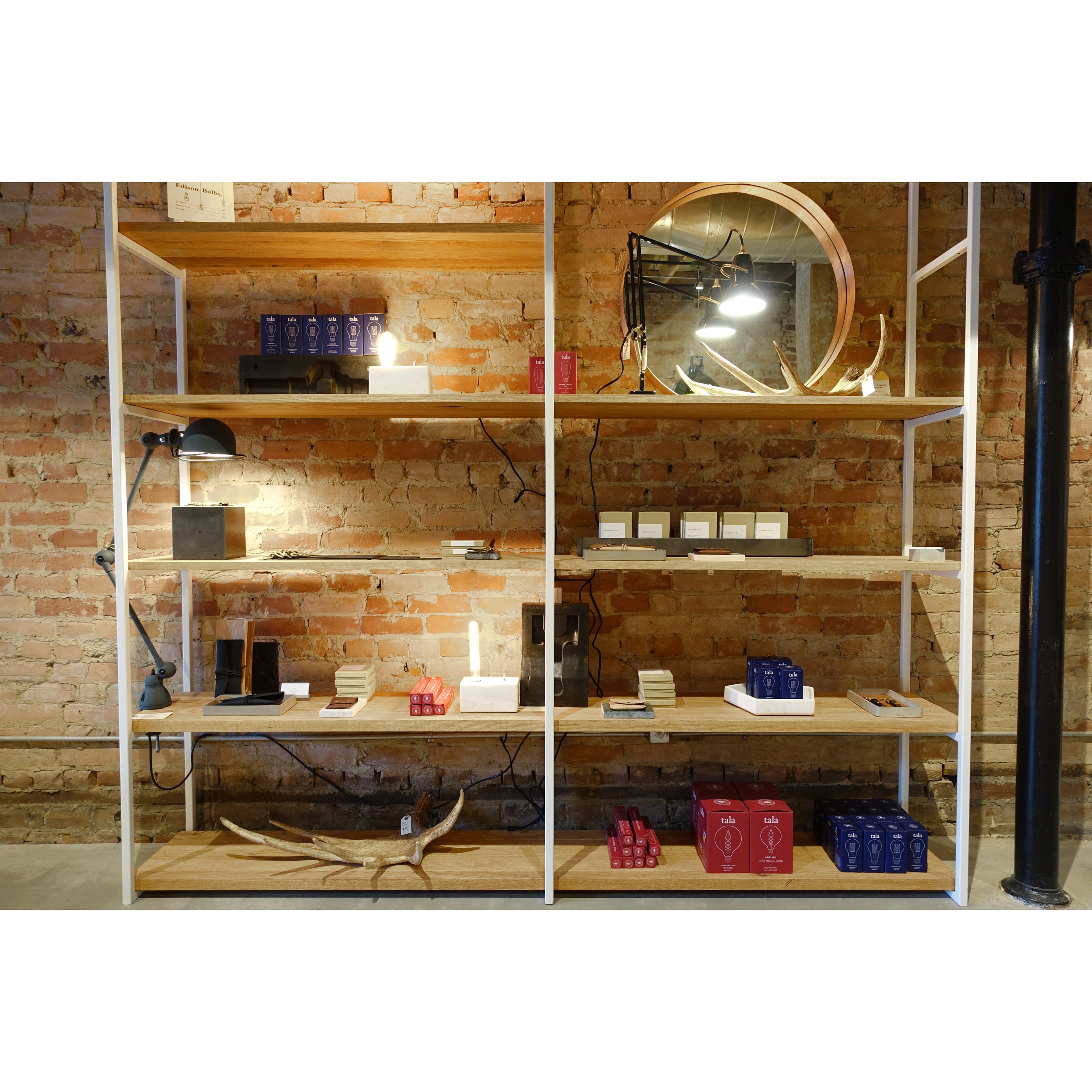 Our classic made to order shelving unit, made with architectural steel framing in powder-coated or stainless finish. Shelves in rough sawn solid oak.