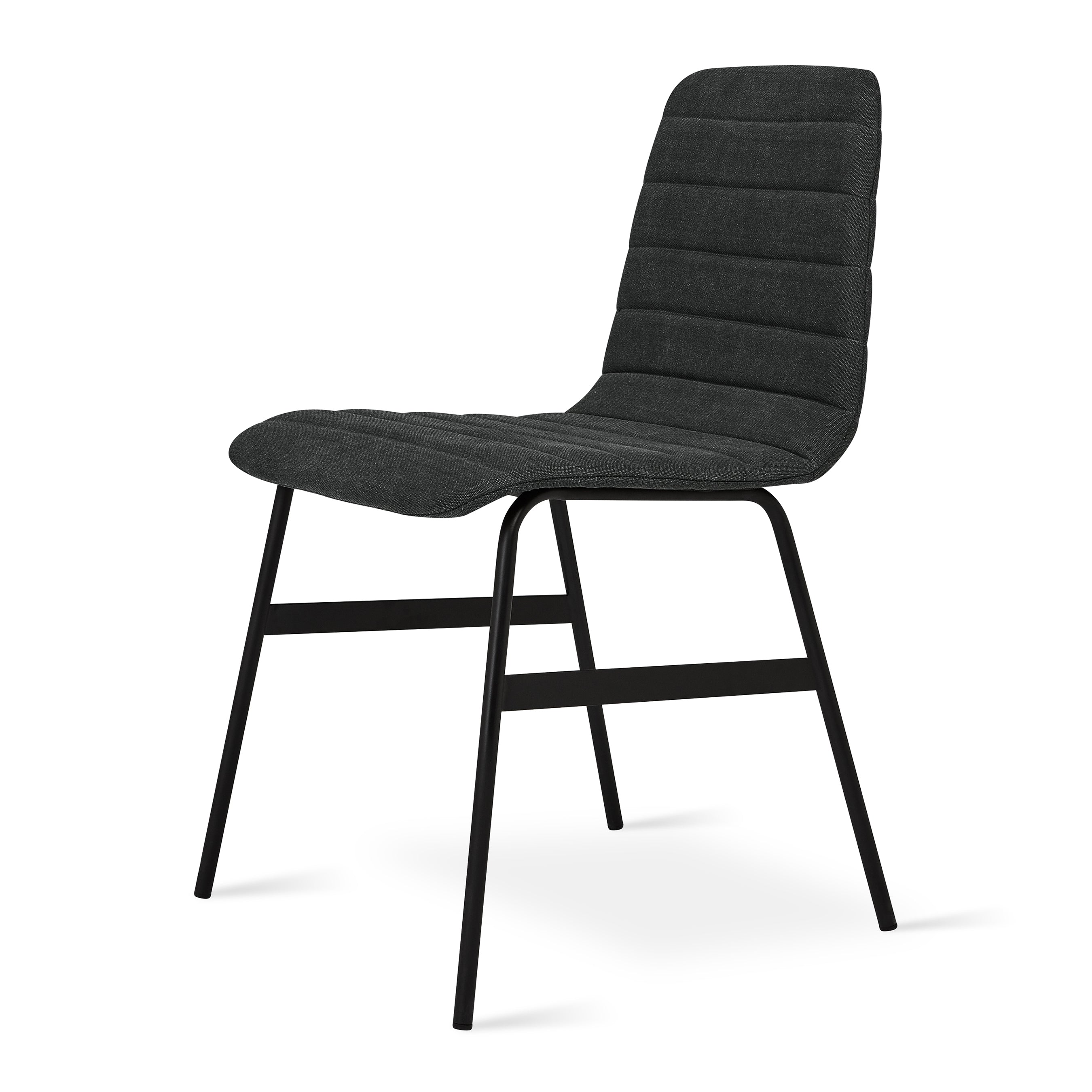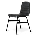 The Lecture Chair is a modern reinterpretation of a classic elementary school chair design. This version features a one-piece, upholstered seat and back, with unique, channel-stitch detailing. The back incorporates a functional leather and brass handle. The black, powder-coated steel legs are reinforced with solid metal stabilizers. Functional, comfortable and stylish, the Lecture Chair works well for any workspace or dining area.
