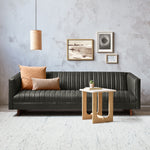 The Wallace Sofa is a modern reinterpretation of the classic English Chesterfield design. The channel-stitched leather upholstery on the seat, back, and arms creates a surface that is both visually striking and remarkably comfortable. Piping details, sloping armrests and an angular wooden base add sculptural, contemporary flair, while luxurious channeled padding make it perfect for lounging. Available in two classic leathers, chosen for their unique grain characteristics that will age beautifully and develop a rich natural patina over time. Matches perfectly with the Wallace Chair.