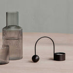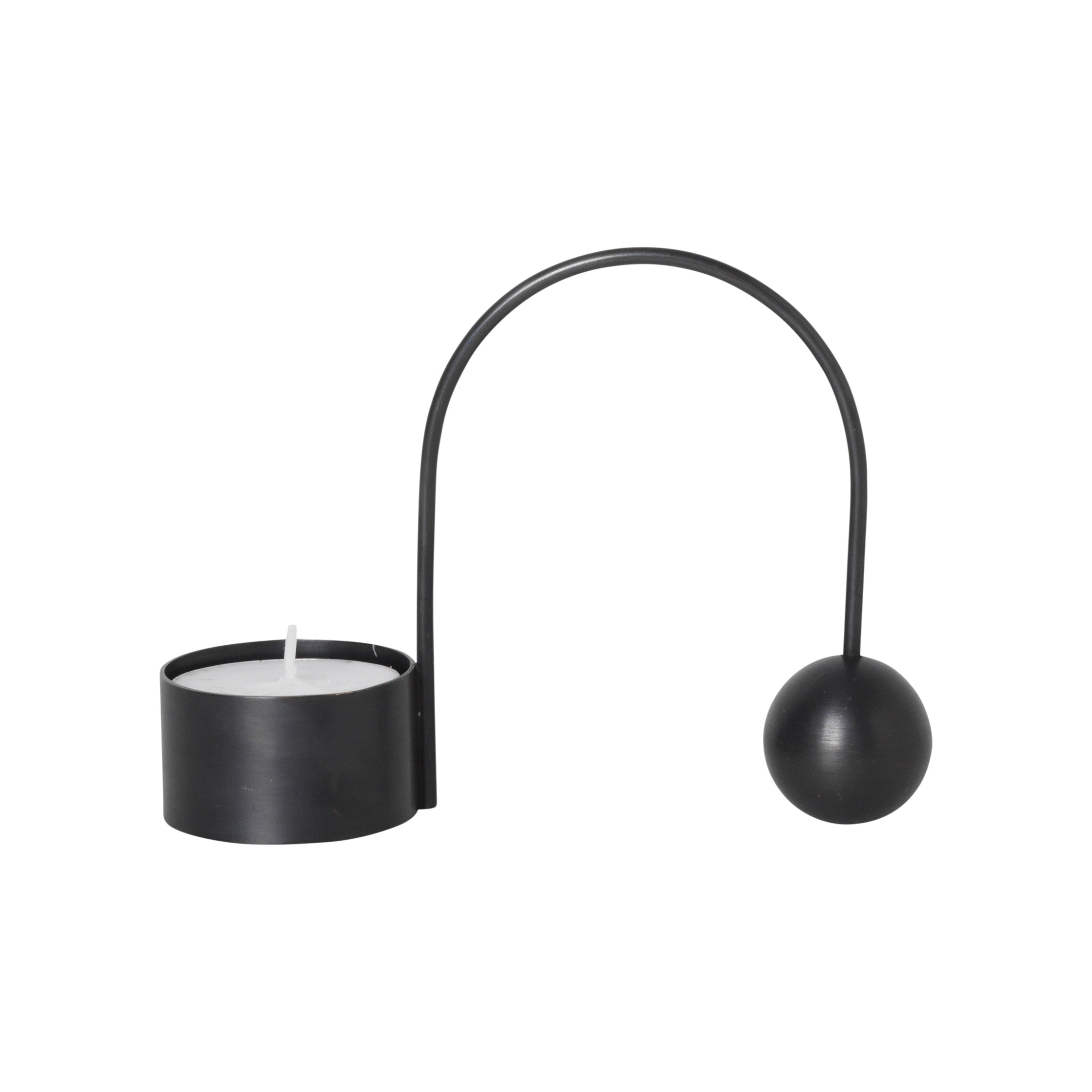 This candle holder displays an exercise in mastering the art of balance with each part counter-weighing the other to reach a moment of tranquil stillness. The geometrical shapes are both sculptural and functional elements, as the arch may be used as a handle to carry the candle holder.