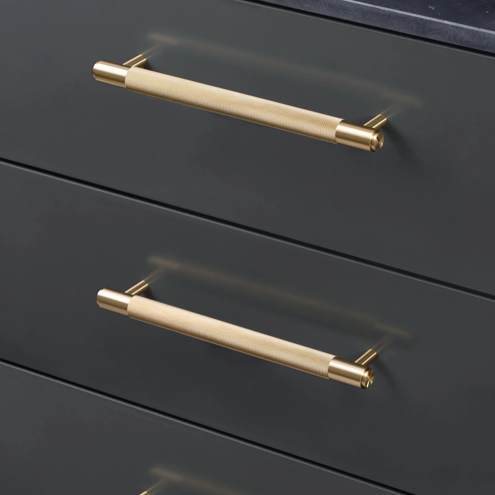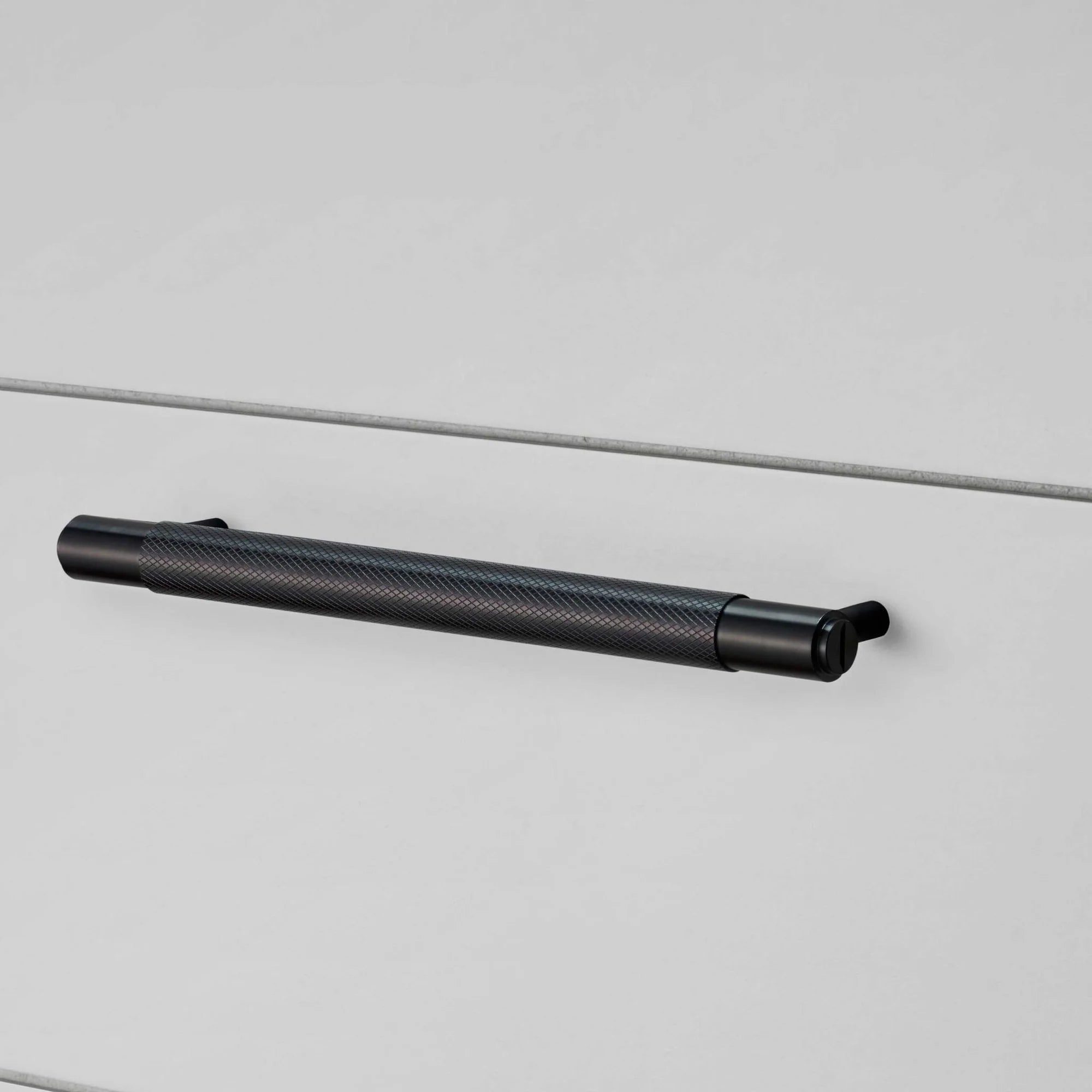 A pull bar made from solid metal in small (150mm / 5.9"), medium (250mm / 9.8") and large (350mm / 13.7") sizes. These pull bars feature our signature, diamond-cut, cross-knurl pattern and is refined by hand. Comes complete with small solid metal discs. They work great on cabinet doors, wardrobe drawers, cupboards and kitchen units.