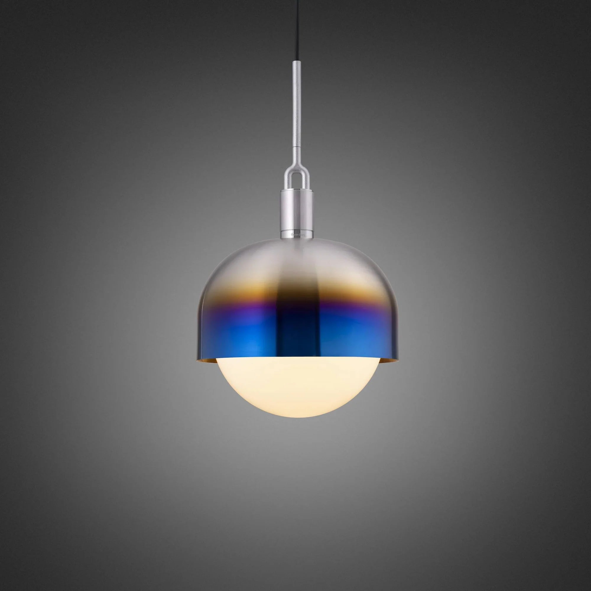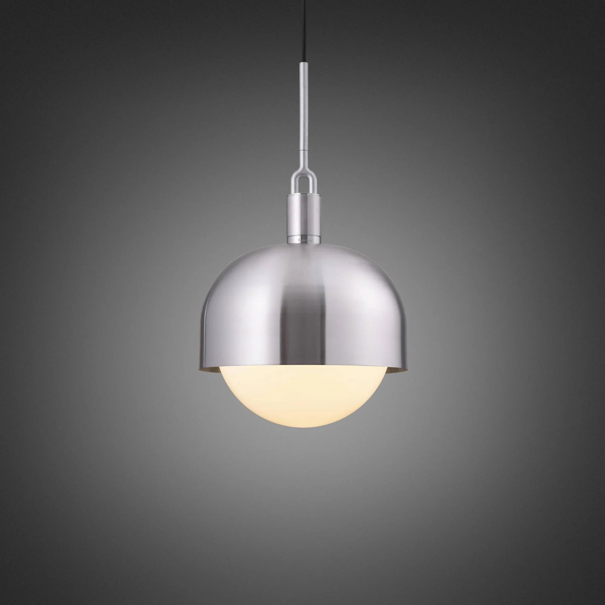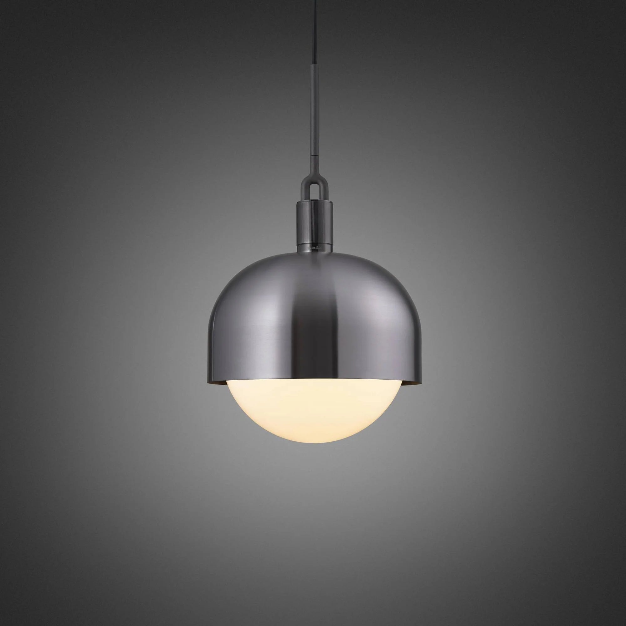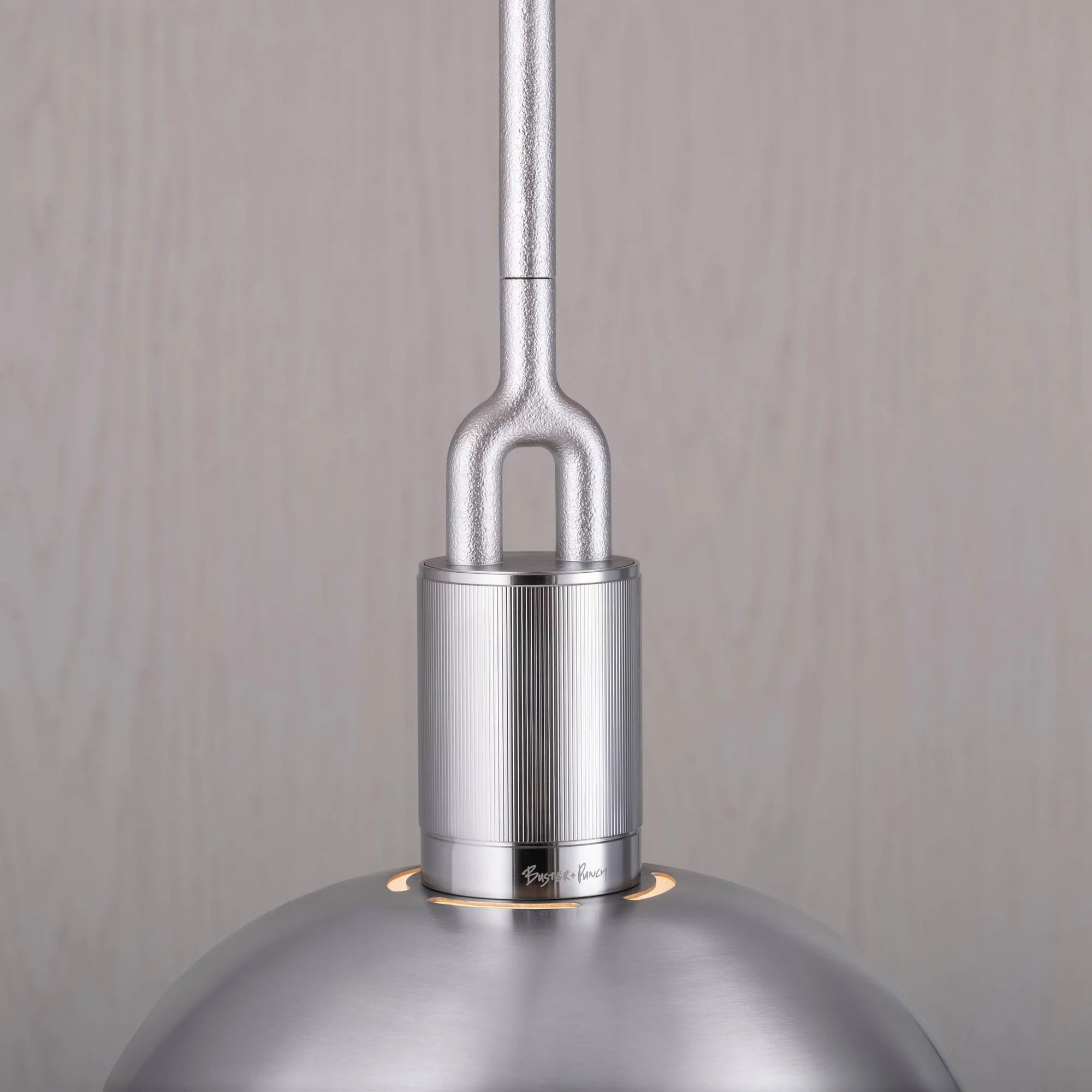 A light pendant made from cast and machined metal, featuring the Buster + Punch signature diamond-cut linear knurl pattern and fork detailing, refined by hand. Its shade is made from hand-spun metal and it comes with a handblown glass globe.