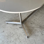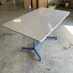 Available online for purchase in our showroom configuration - engineered quartz stone top with powder-coated steel base as shown in the first three images. Contact us or visit the showroom for customization options beyond this specific configuration.