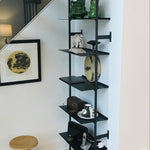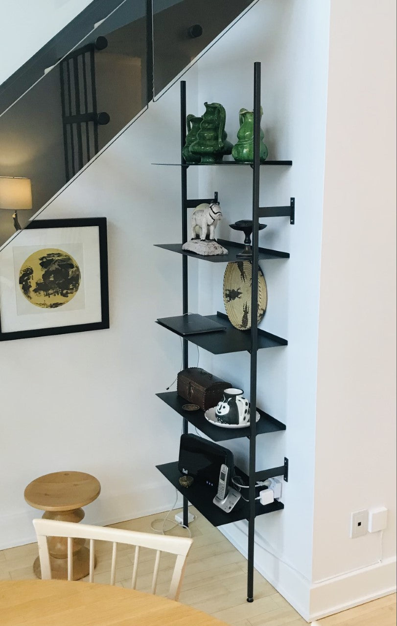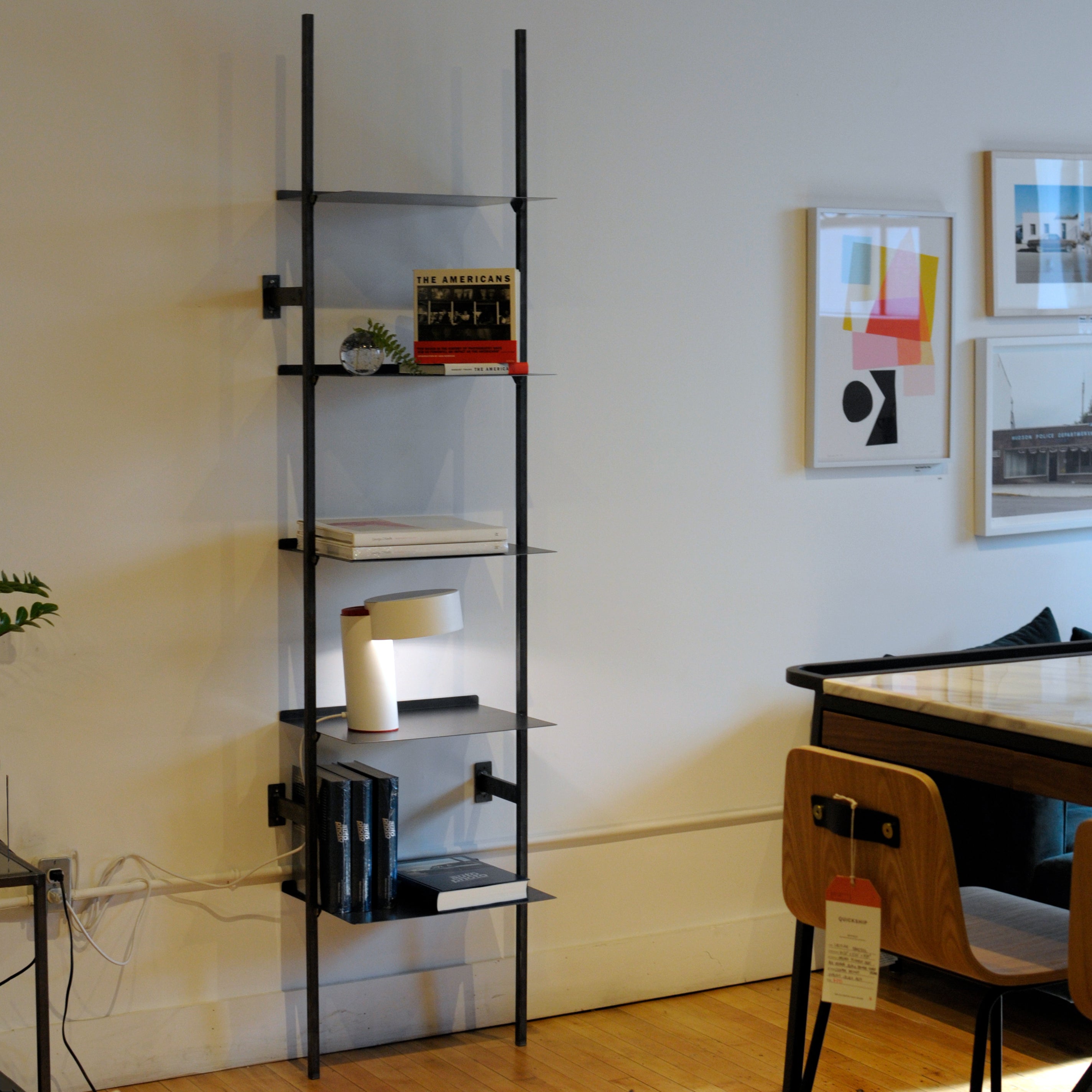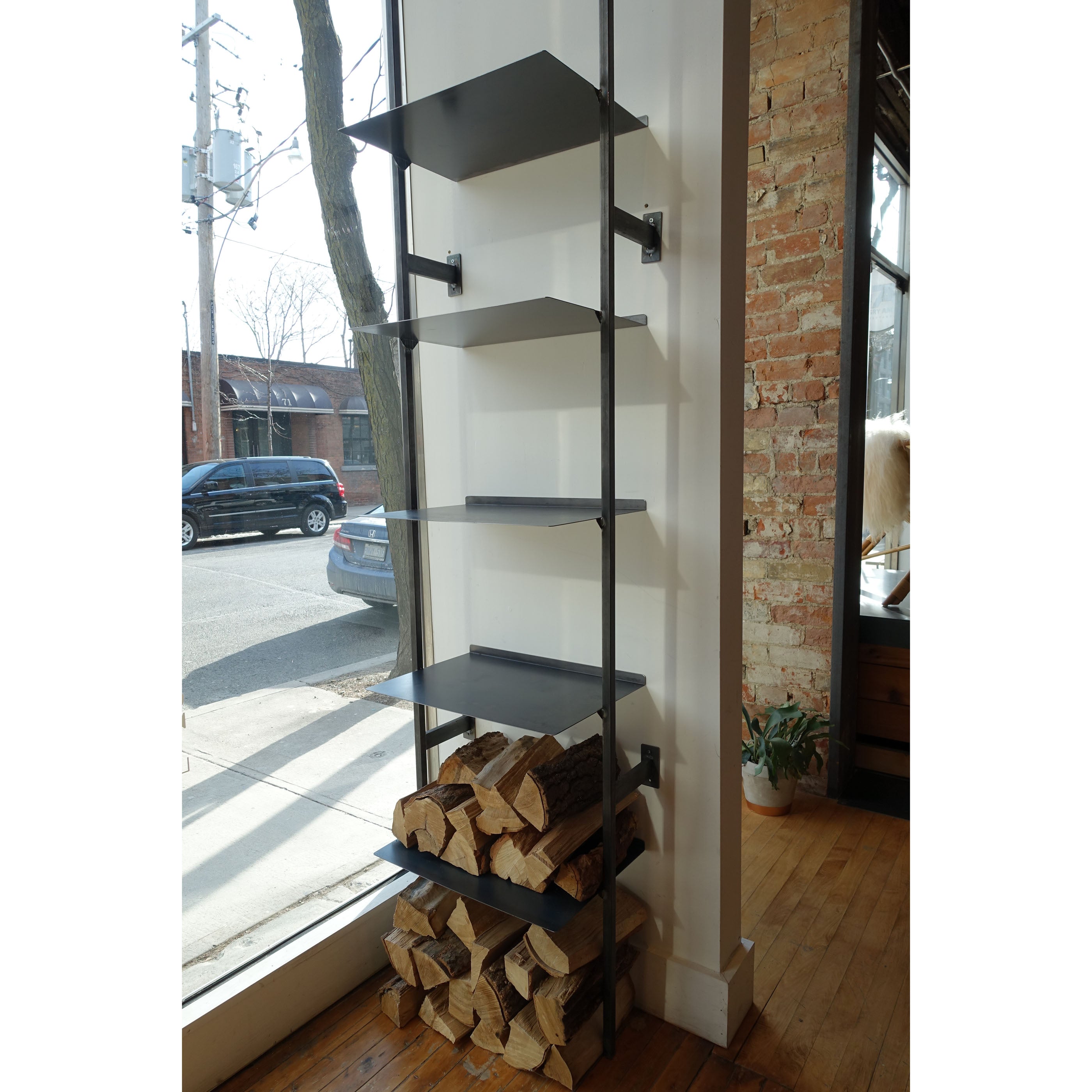 Our custom designed Framework Series features metal framing complimented with a variety of design options like sheet-metal enclosures and wood cabinet inclusions. This shelf can serve to store books or for vinyl record storage. Add brass "socks" on the legs for a unique touch.