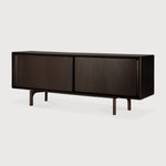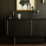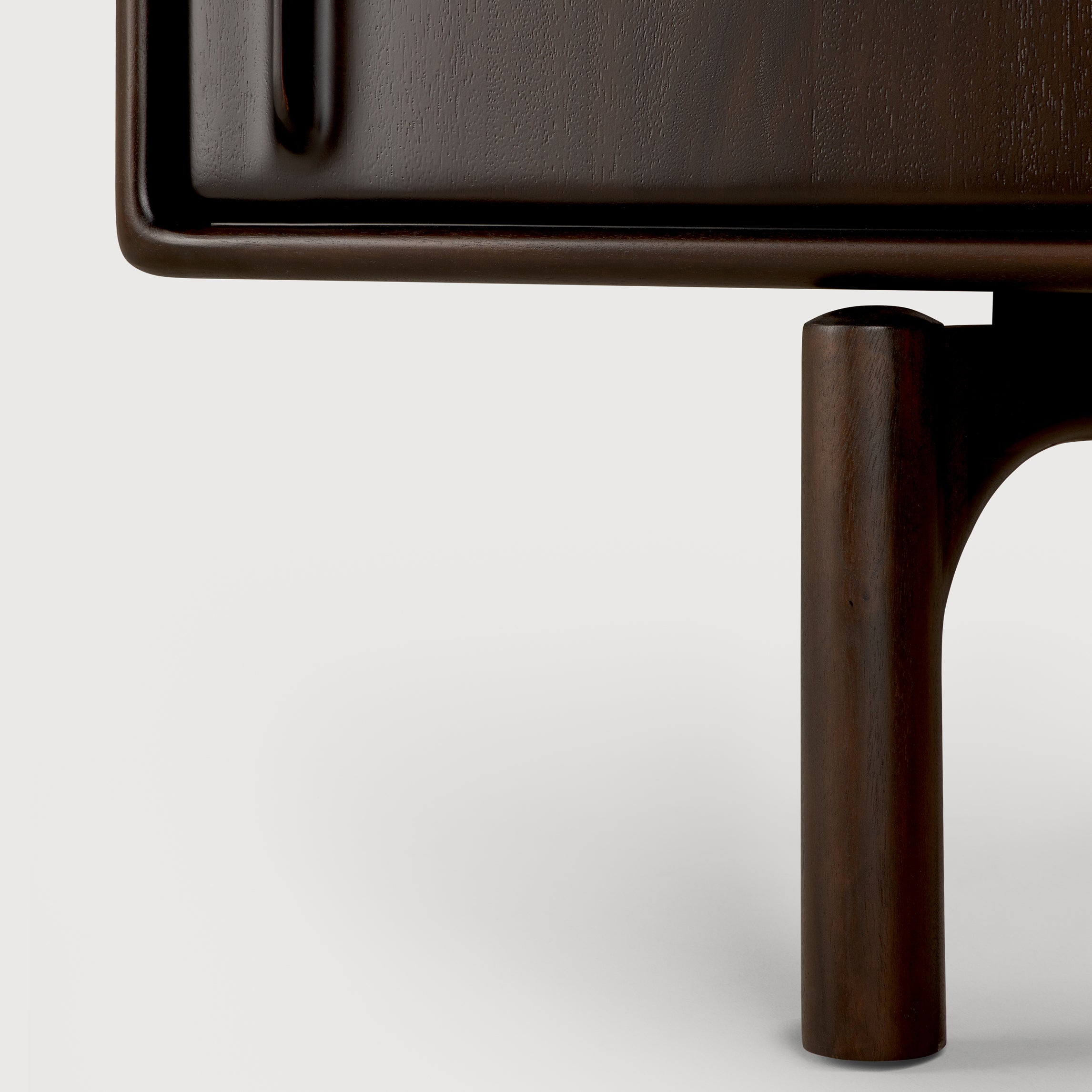 The Flow collection captures a sense of movement through softened edges and fluid lines. With gently rounded corners and subtle curves throughout, each piece exudes a vintage spirit with a refined, modern attitude—poised to complement evolving spaces and needs. The sideboard’s generous top and internal shelving offer practical storage with visual appeal. Crafted from solid mahogany with a rich varnish finish that highlights the natural grain, it stands on distinctive legs that lend a light, elevated stance to this functional classic.