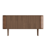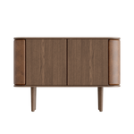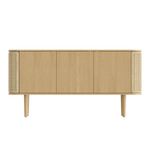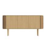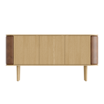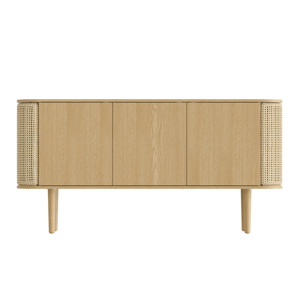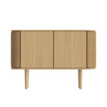Treasures is a customizable cabinet with a Nordic design, crafted from veneered oak wood. Its curved sides feature a soft, tactile covering and open like wings to reveal elegant storage for liqueurs, books, ceramics, and porcelain. The central compartments each include a shelf for added organization.