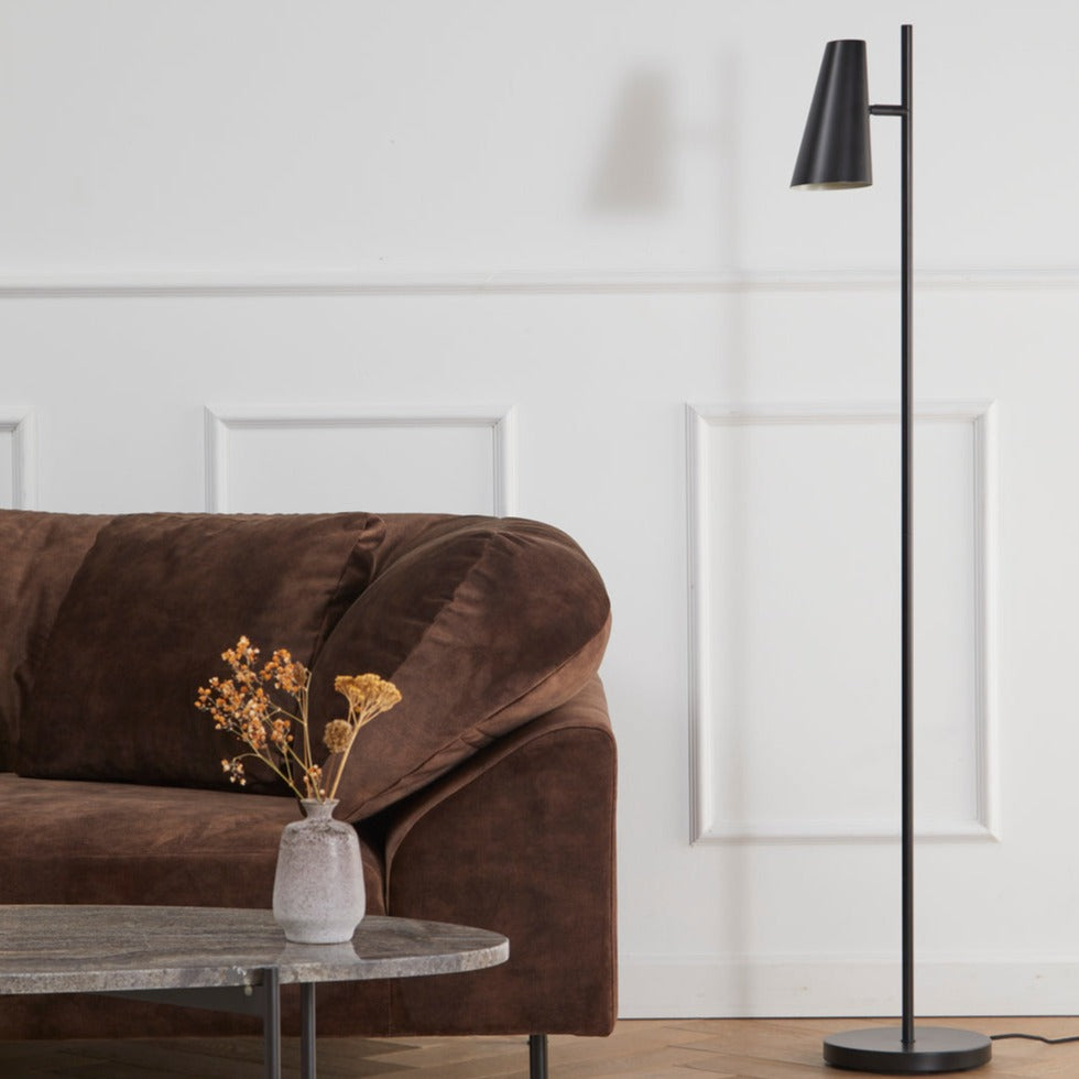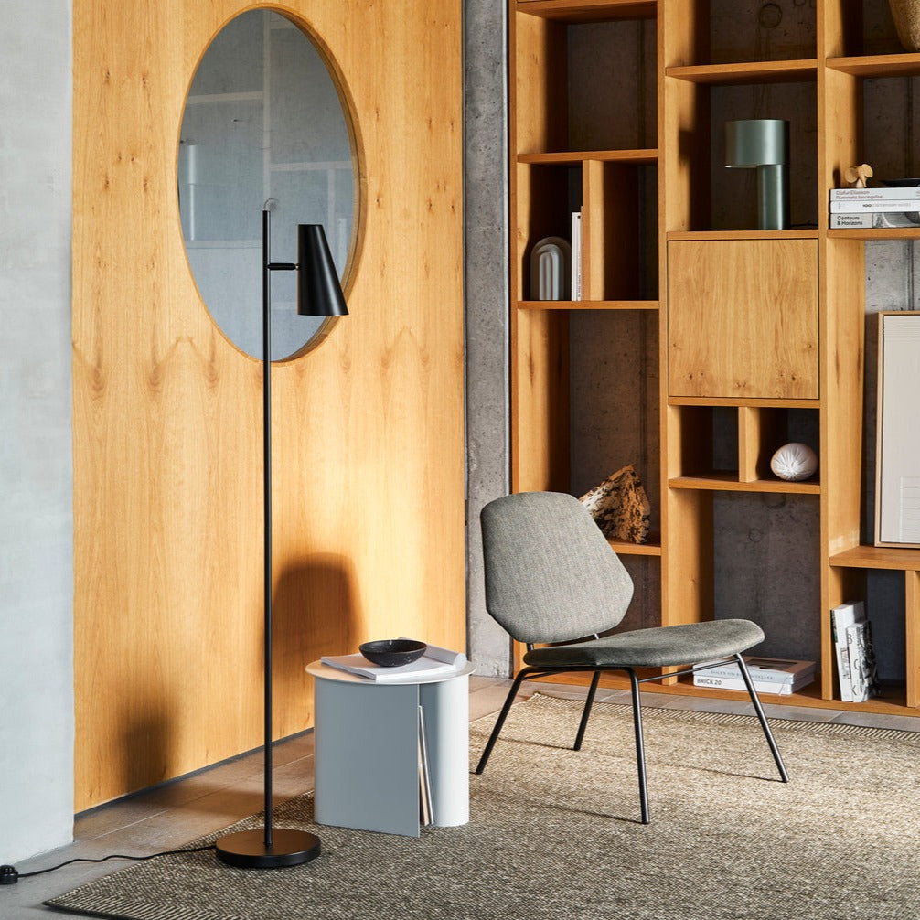The Cono floor lamp is characterized by the classic geometric shades combined with a minimalistic yet soft visual expression. The adjustable shade serves a practical lighting purpose which is enhanced by either a matt or satin surface. The lamp's name, Cono, is a nod to its classic geometric design, drawing inspiration from the mathematical conoid shape.