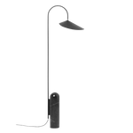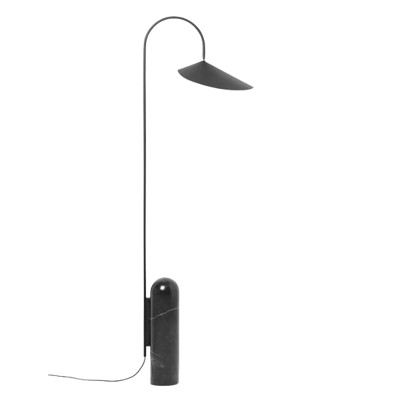 The Arum Floor Lamp is characterised by the black solid marble base combined with the organically shaped lampshade. Achieving the perfect balance in the off-centre structure of the lamp, the black marble foot counterweighs the gentle way the lampshade is suspended from the curved metal arch in a leaf-like manner. With the matte, off-white inside of the shade, the lamp provides a soft, evenly distributed light, and the lampshade can be adjusted to ensure optimal light conditions in all situations.