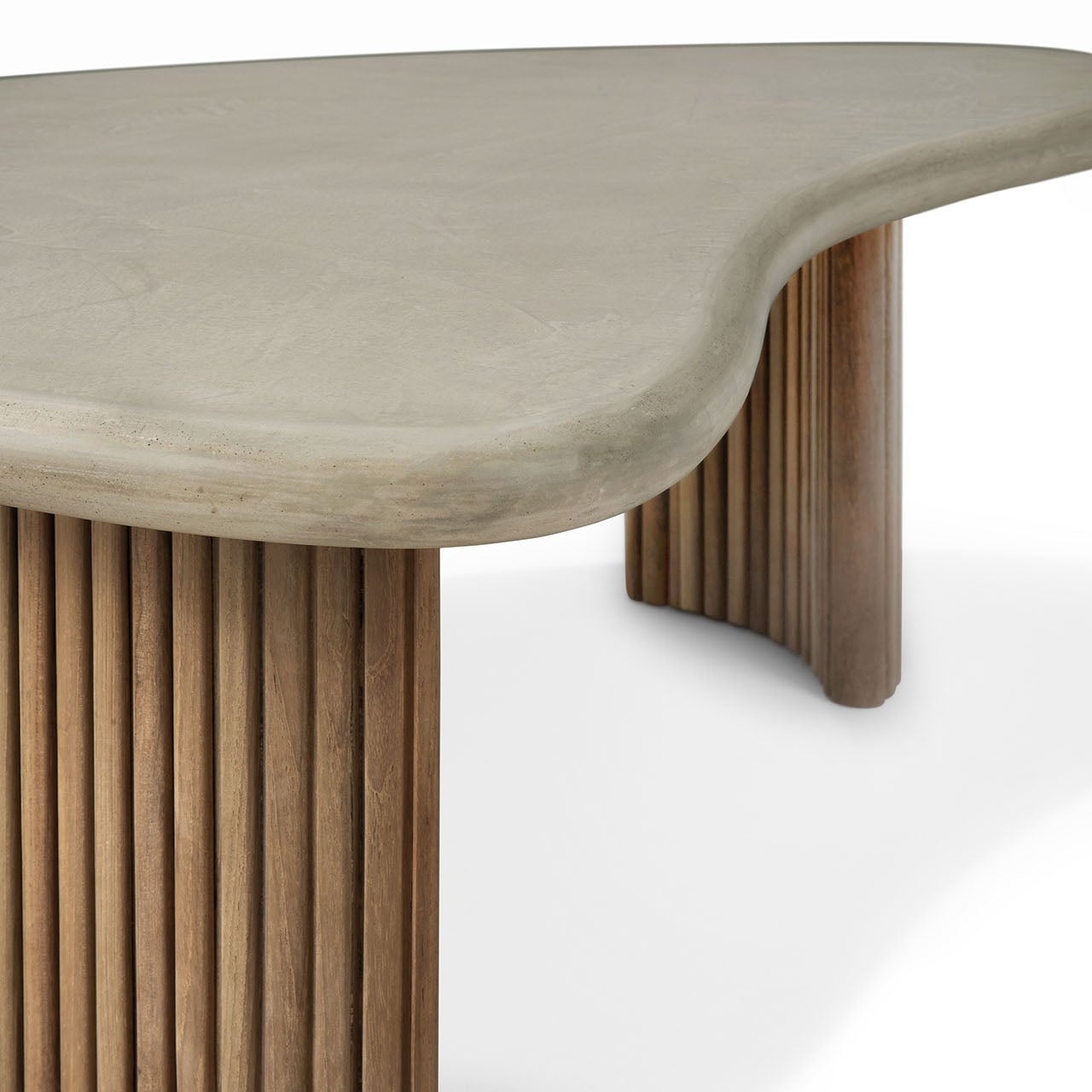 Playful, pebble shapes set on a beautiful, folded, base. Inspired by its popular indoor design, the Boomerang outdoor coffee table features a hand-finished concrete top, paired with a reclaimed solid teak base, a beautiful material mix provides durable practicality to both indoor and outdoor spaces. Configured with the two sizes together, or as a stand-alone, this well-proportioned design is sure to capture attention.