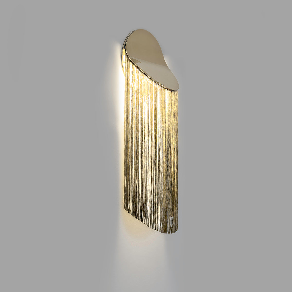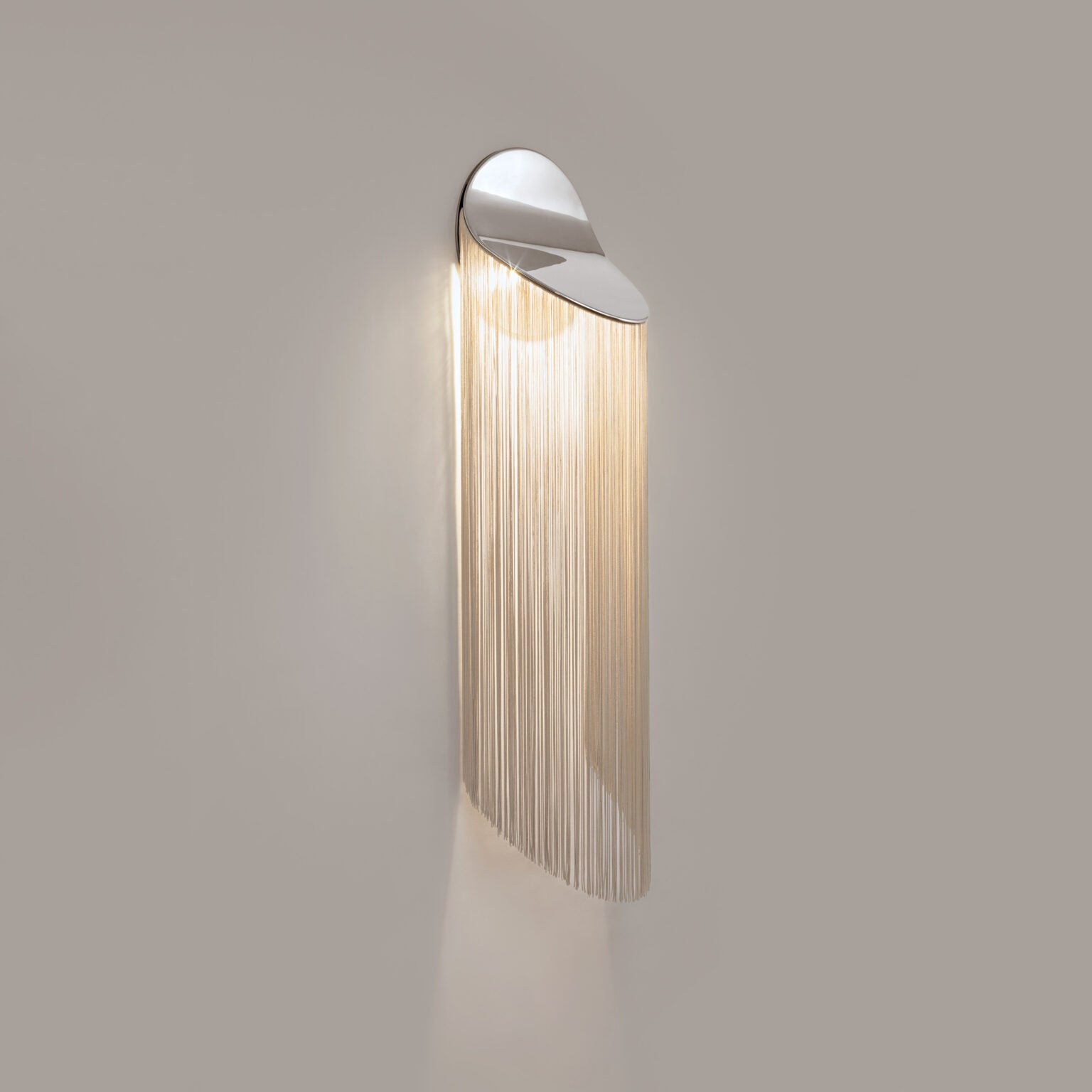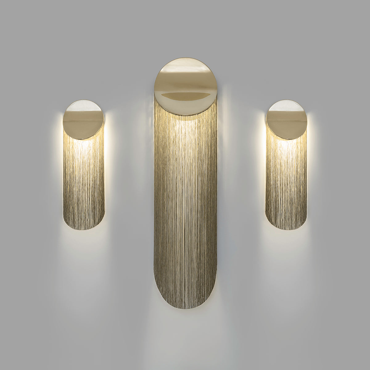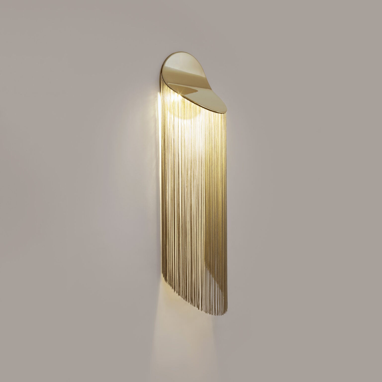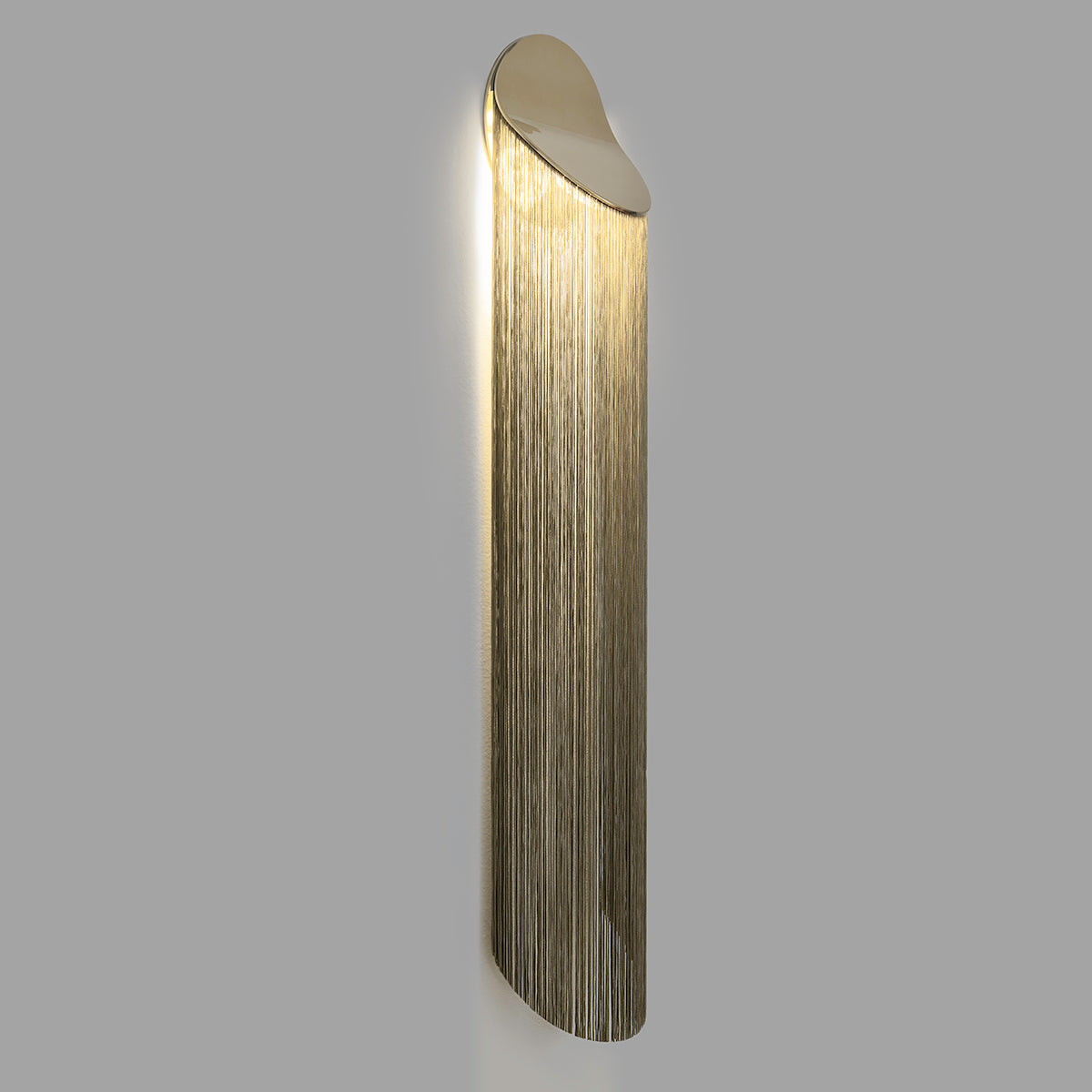 Cé audaciously blends fringes and solid bronze revealing a well-rounded wall mounted fixture. The unique movement of the fringes brings a fluid effect, distinguishing this piece from previous collections, all the while remaining faithful to the minimalist look of candid lines present in each of d’Armes creations.