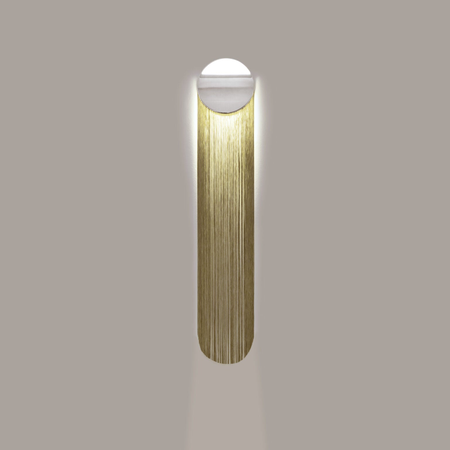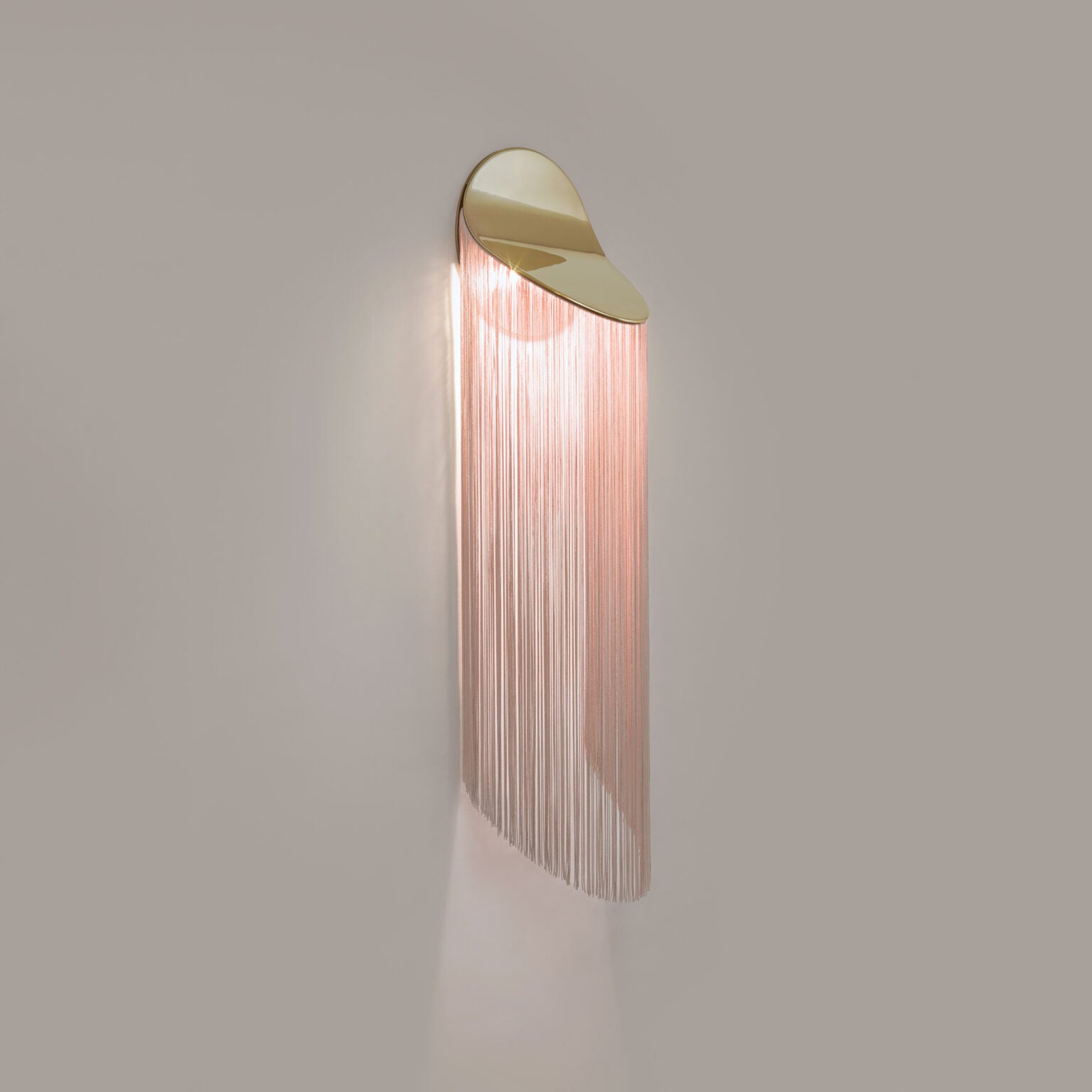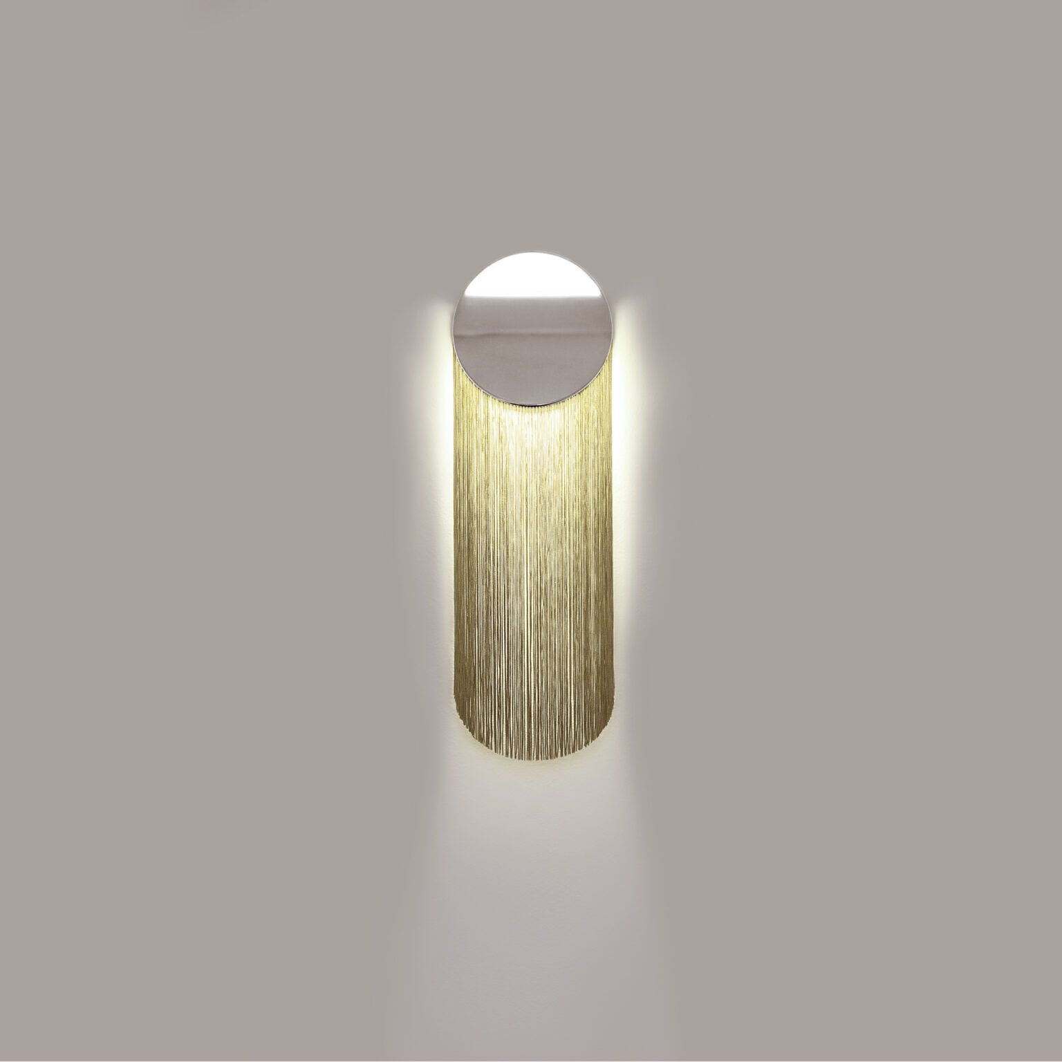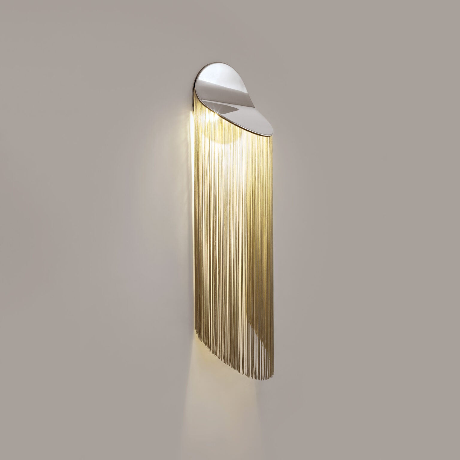 Cé audaciously blends fringes and solid bronze revealing a well-rounded wall mounted fixture. The unique movement of the fringes brings a fluid effect, distinguishing this piece from previous collections, all the while remaining faithful to the minimalist look of candid lines present in each of d’Armes creations.