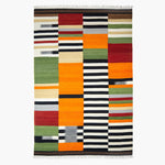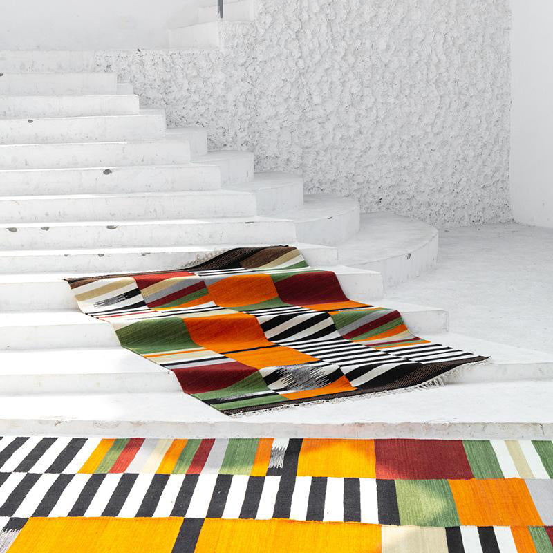 CHANTERELLE is a Kilim rug. Kilim is the name for a thin, flat, tapestry-woven, graphic style rug. It is made by weaving the horizontal yarn (weft) through vertical yarn (warp). The rug is woven so tightly that the warp is barely visible. This makes for a very durable rug, that can handle weight and movement.