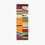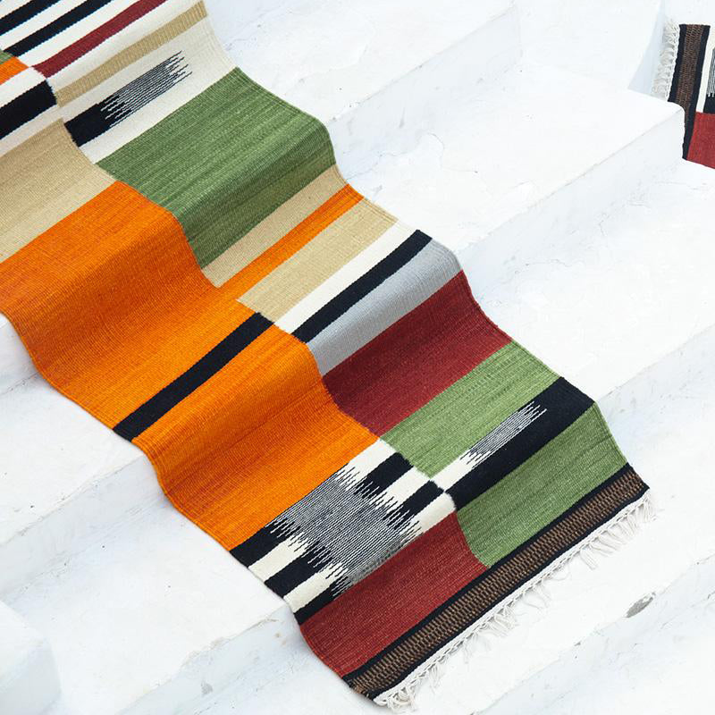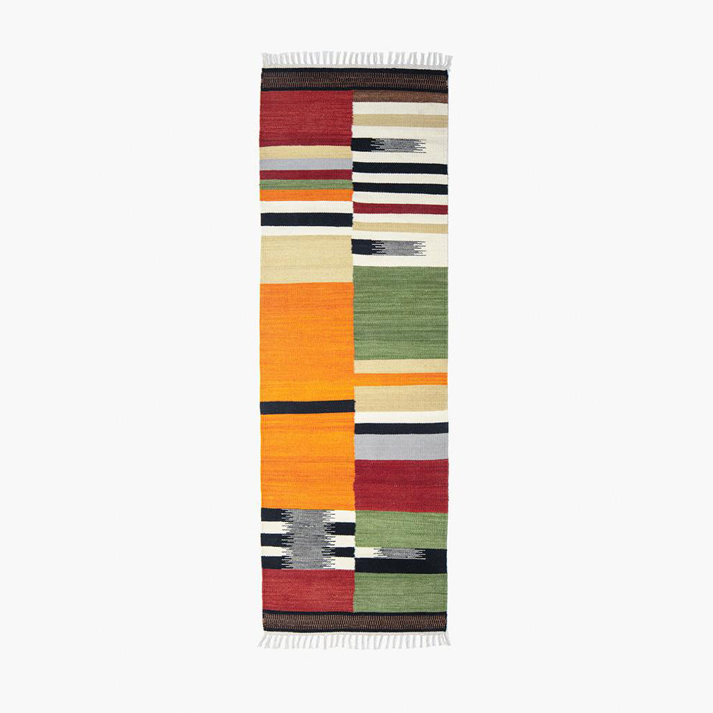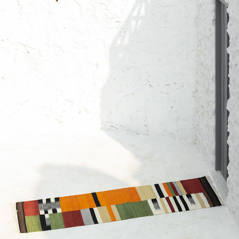 CHANTERELLE is a Kilim rug. Kilim is the name for a thin, flat, tapestry-woven, graphic style rug. It is made by weaving the horizontal yarn (weft) through vertical yarn (warp). The rug is woven so tightly that the warp is barely visible. This makes for a very durable rug, that can handle weight and movement.