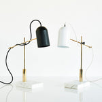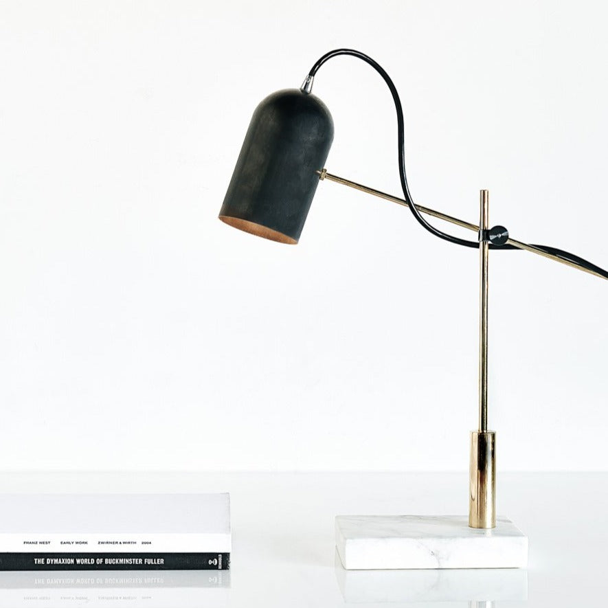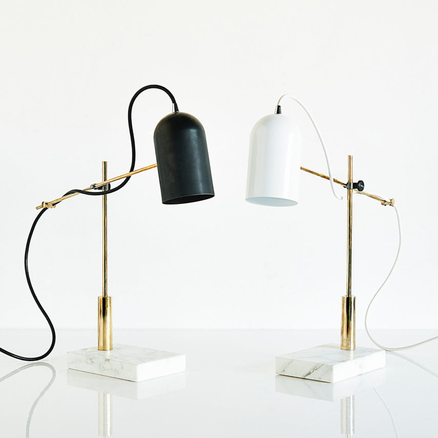 The Catherine table lamp is designed around a cylindrical shade salvaged from a defunct lighting factory. It has a base made of Carrara marble salvaged from the First Canadian Place in Toronto and has a support made of precisely machined brass.