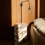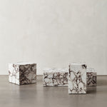 The solid mass of the Plinth marble stands in contrast to the honed surface; light bounces off of the angles and falls across the tops, producing a spotlight-effect in any space. Though the geometry of the podium is sharp and clean, the organic linearity of the marble's natural veining is at the forefront of its visual identity, creating an intriguing contrast within each piece.