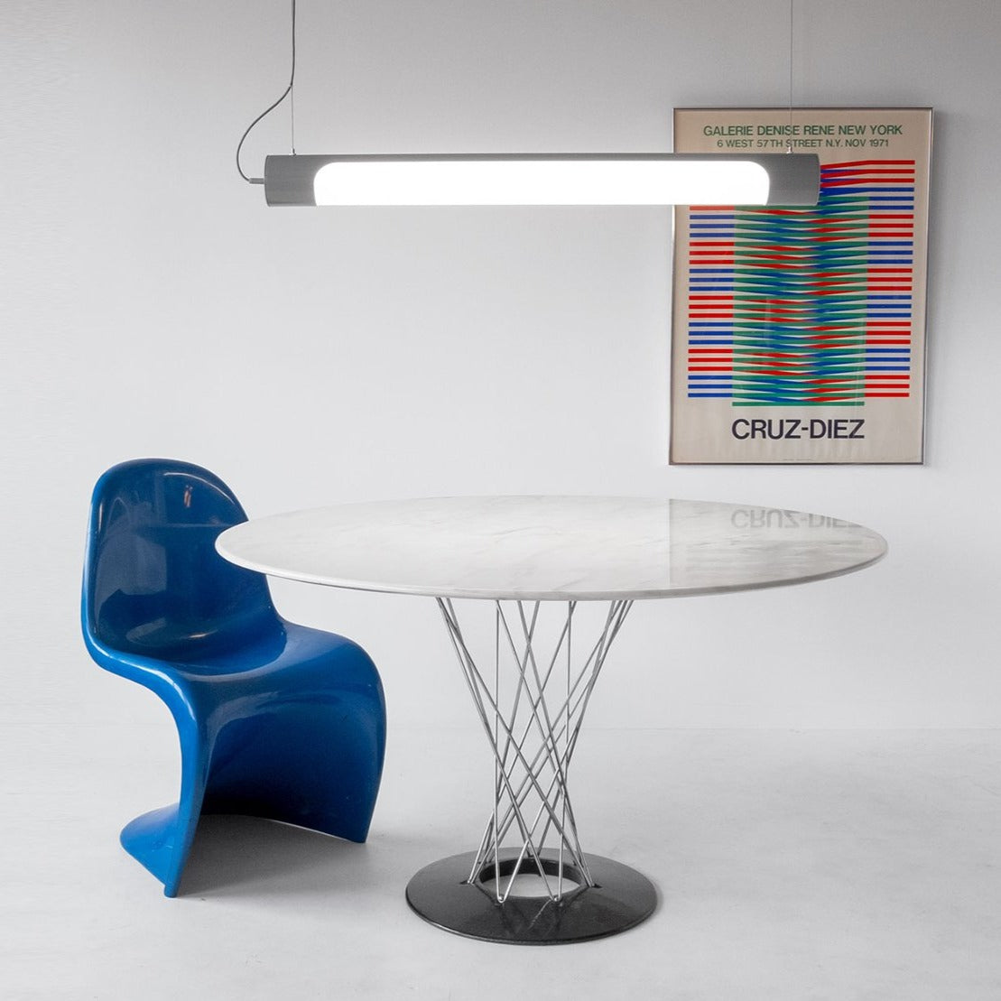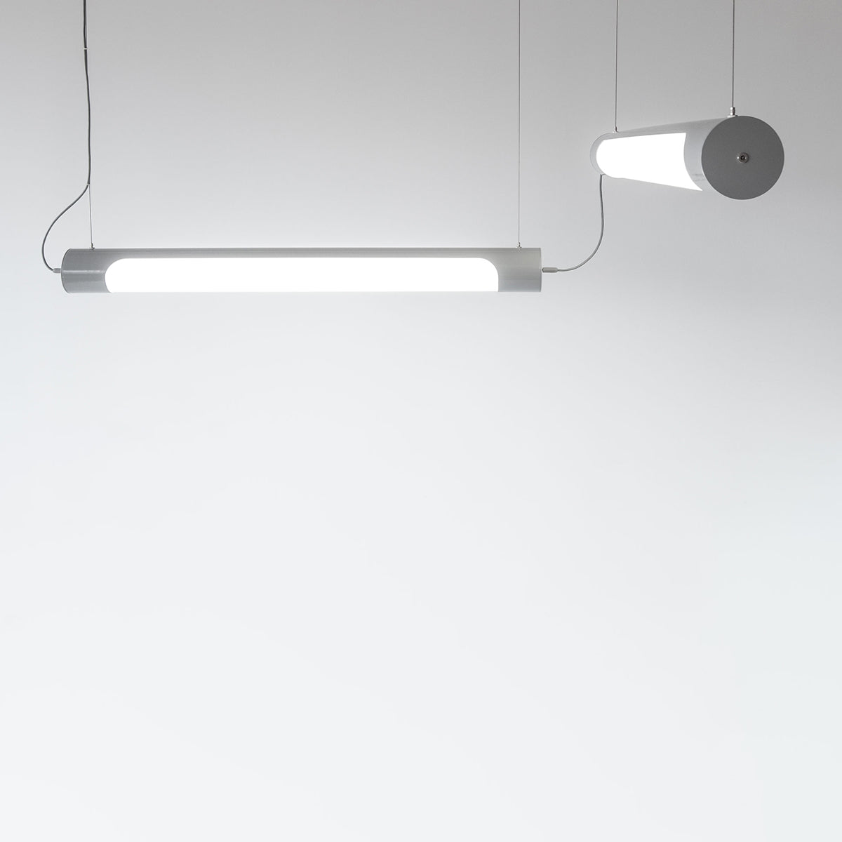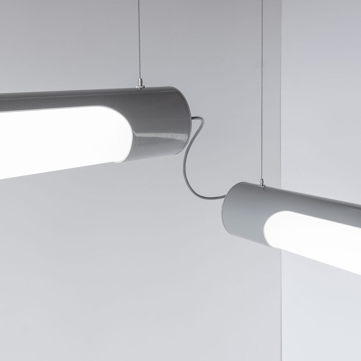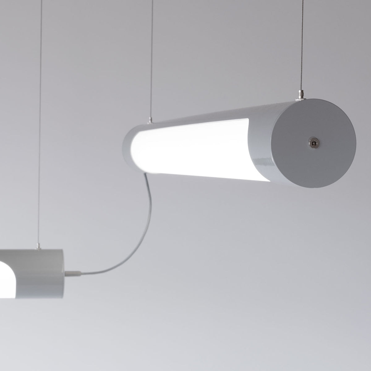 “Middle Grey” is the name given to the 18% black shade that appears to the eye to be halfway between black and white. The Middle Grey Pendant is made from laser-cut extruded aluminum tube, and uses an Acrylite® Satinice diffuser to enhance the light from its LED source. The pendant lights are linkable between their barrel jack end caps.