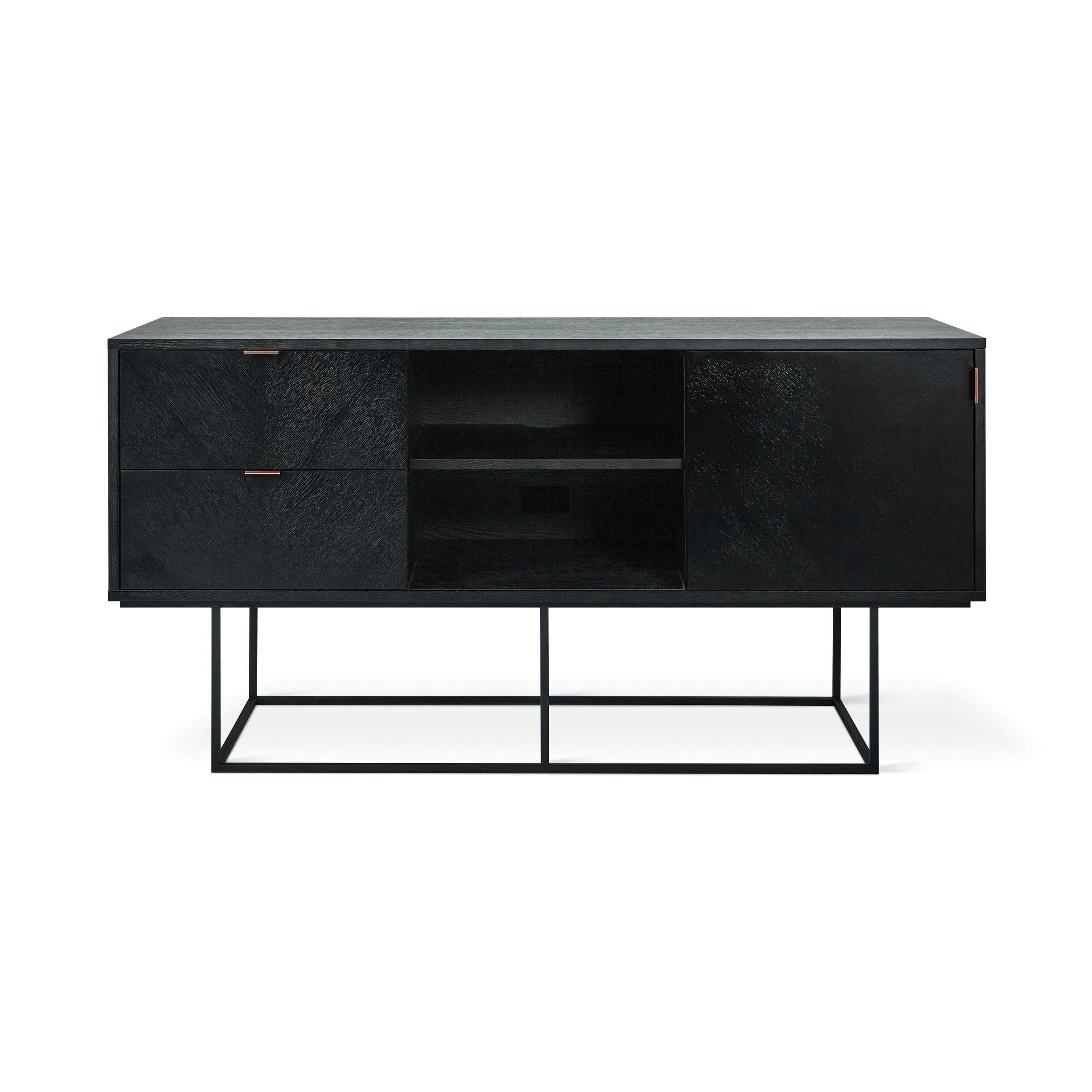 The Myles Media Stand combines subtle details and craftsmanship to create a storage design that exudes simple sophistication. A drawer features rose gold handles contrasting dark stained, chevron-patterned oak faces. A recessed, slender steel base with black, powder-coated finish creates an illusion of weightlessness. Designed for Hi-Fi and media components, a back panel opening in the cabinet allows for concealed cable management. Drawers provide storage to keep your living room uncluttered, while adjustable shelves and a sliding front panel let you reveal or conceal components. Part of the Myles Storage Series, this Media Stand matches perfectly with the Myles Credenza and End Table.