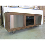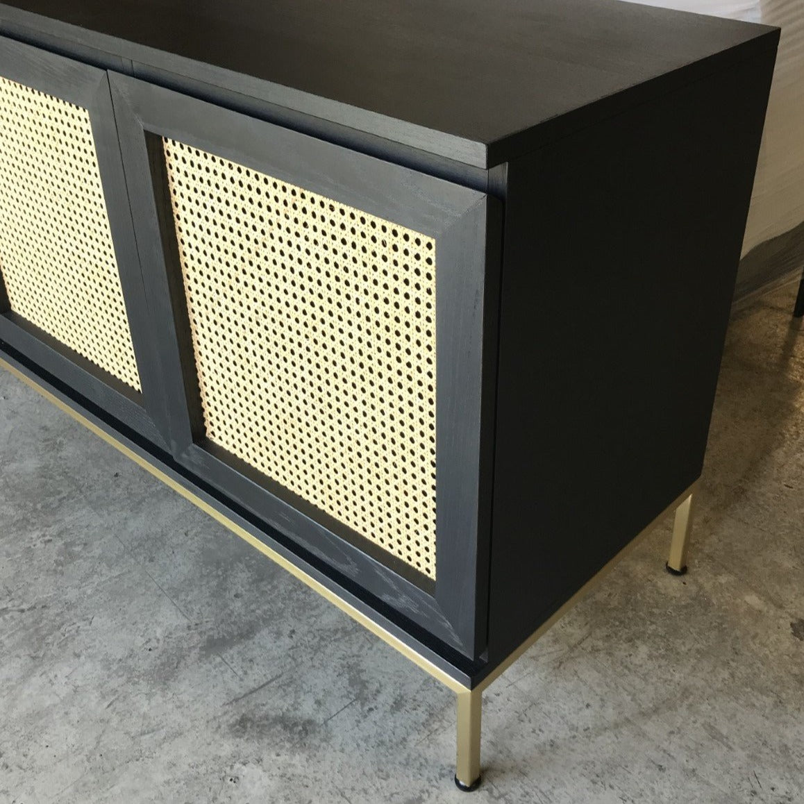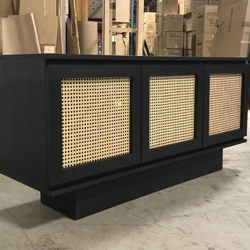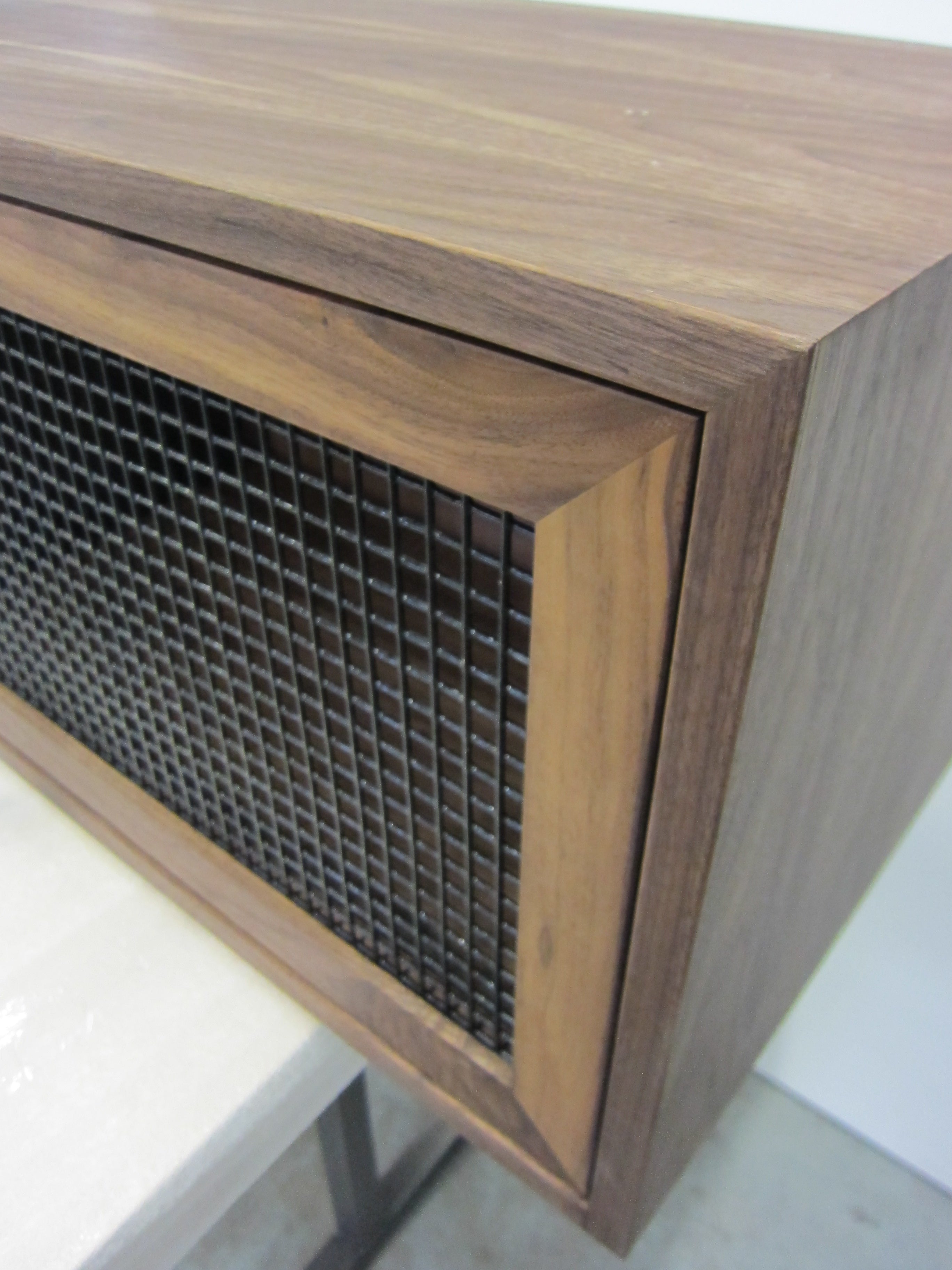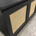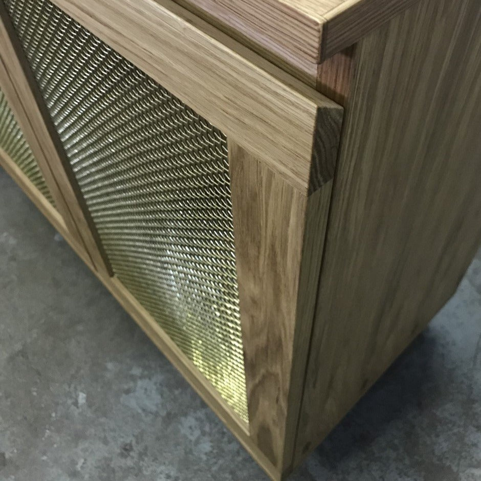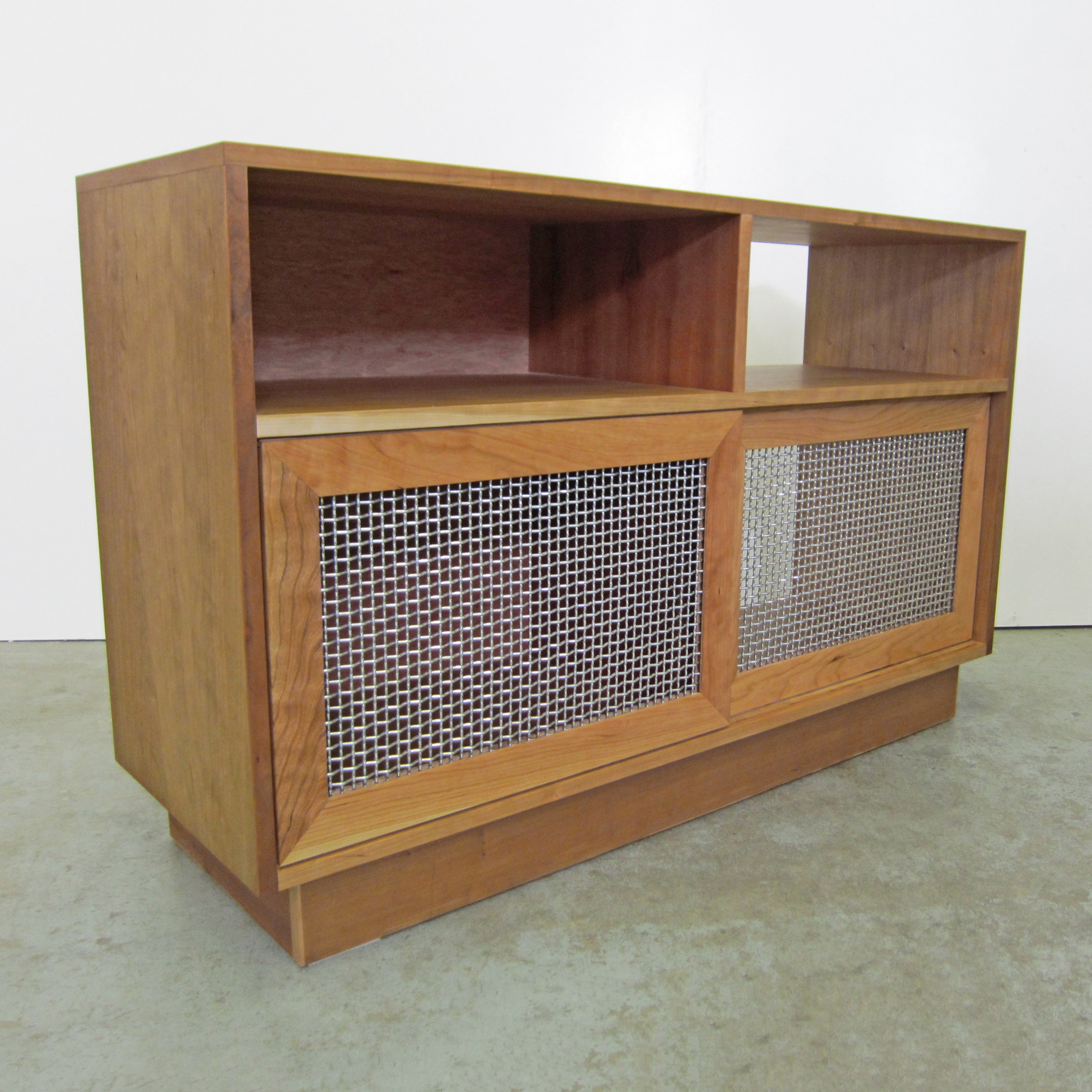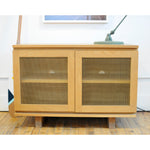 The Peek Media stand is a playful way to highlight or hide your goods. Inset metal mesh or caning on solid wood framed doors is the defining feature of this design.