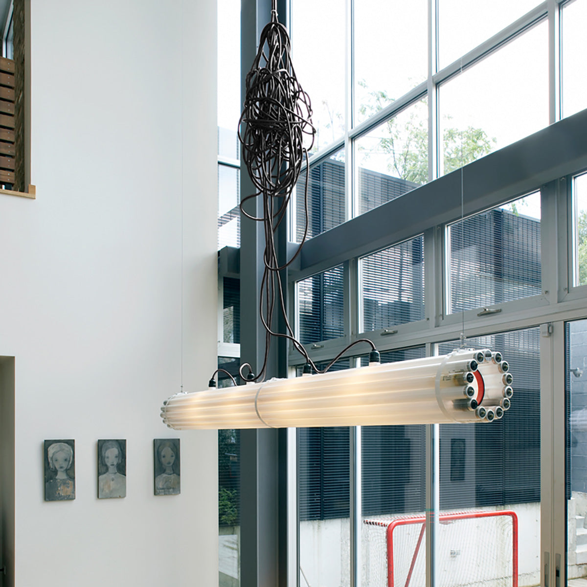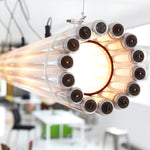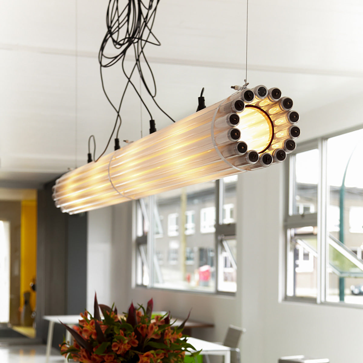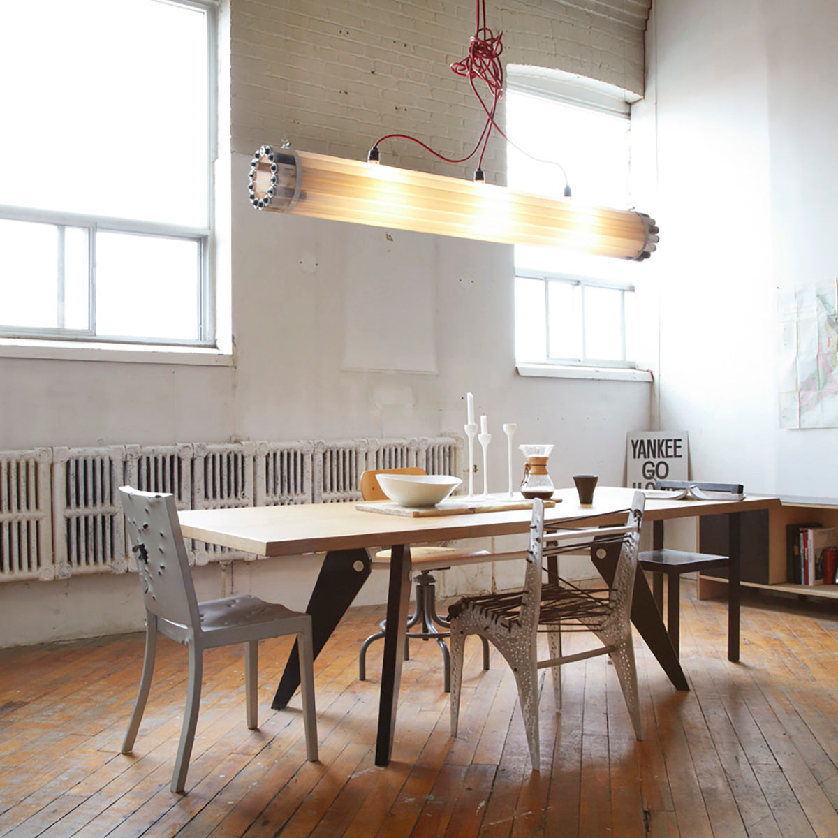 The one and only, the original – the classic. The Recycled Tube Light is comprised of burnt out fluorescent bulbs that are lit from within by LED light bulbs. Red and black cord options are available, intended to be presented in a bundle above the light.